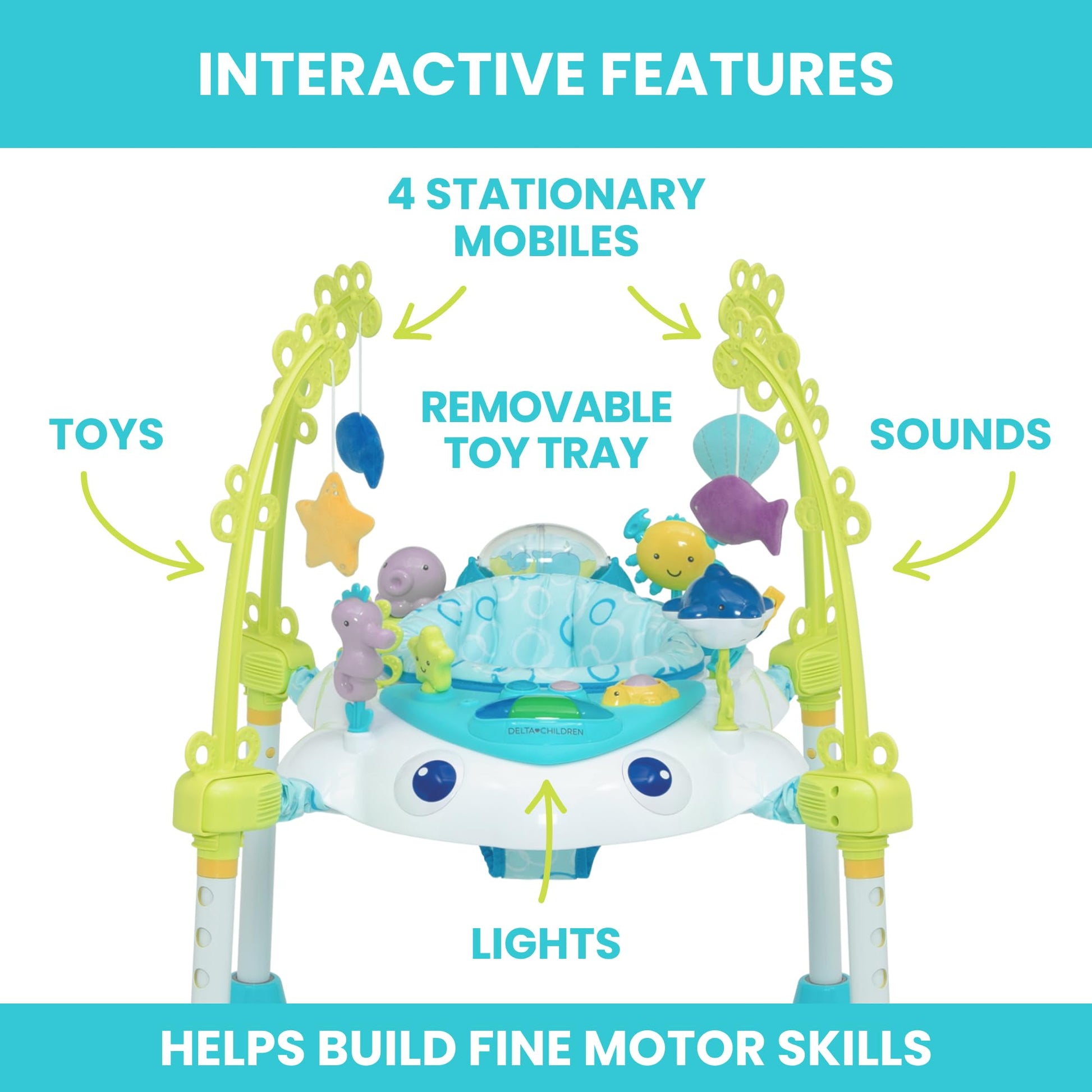 - Q: What features does the stationary play station offer? A: The stationary play station includes interactive lights, sounds, toys, and four stationary mobiles with plush sea creatures for added entertainment.