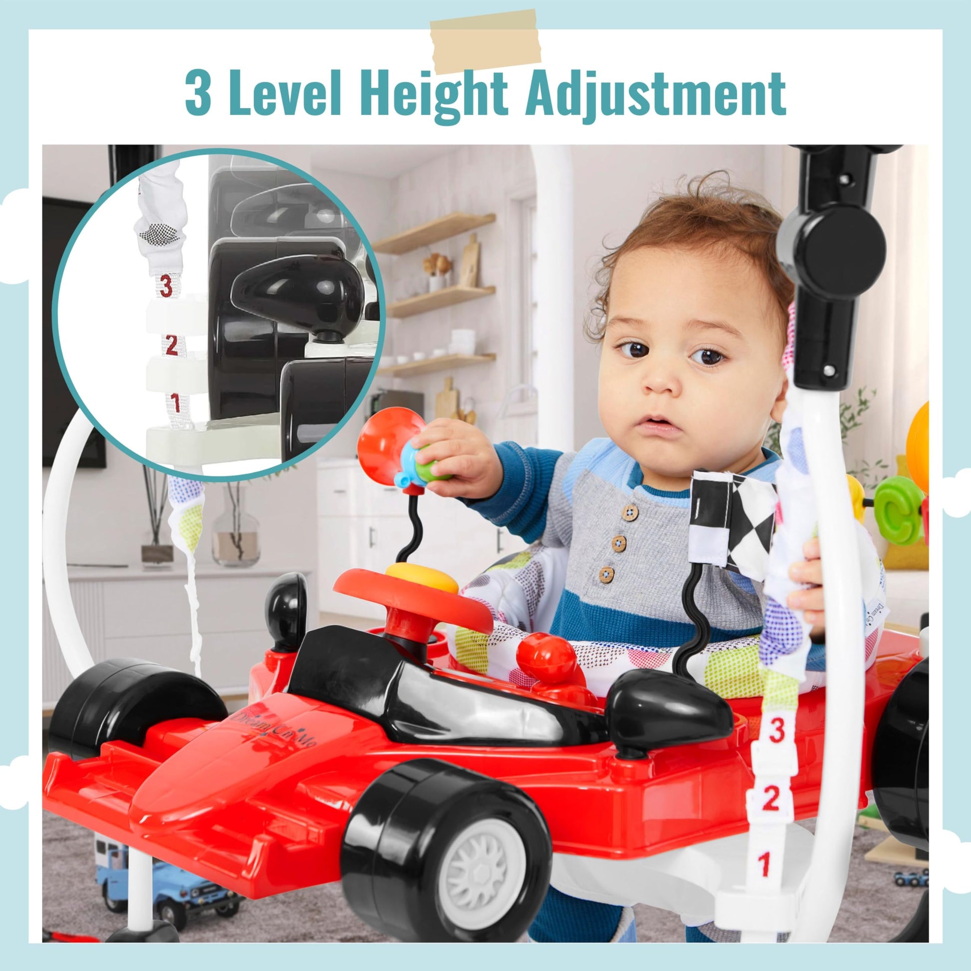 - Q: How many height settings does the activity center have? A: The Champ features three convenient height settings to grow with your child.
