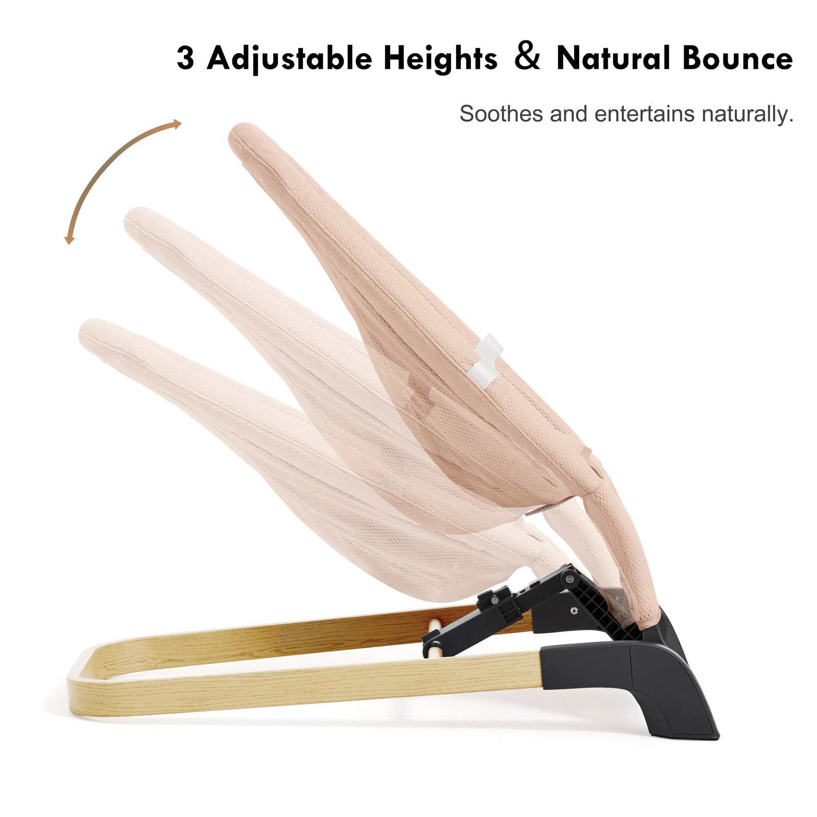 - Q: How does the height adjustment feature work? A: The baby bouncer has a 3-height adjustment system that allows you to effortlessly switch between feeding, napping, and play modes with one-hand height control.