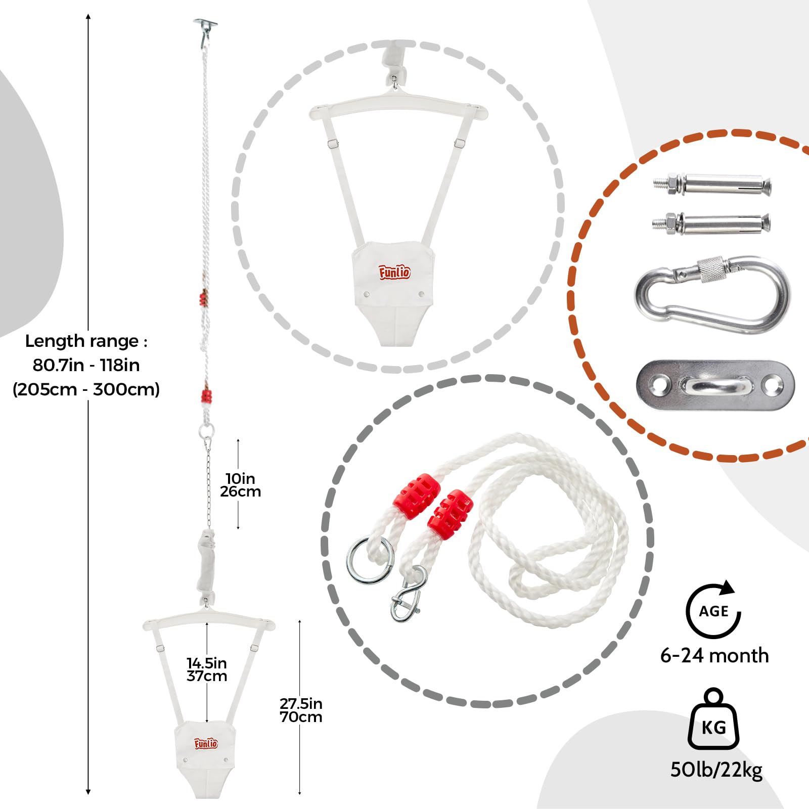 - Q: Is the chain length adjustable? A: Yes, the chain length of the FUNLIO Baby Jumper is adjustable up to 10 inches.