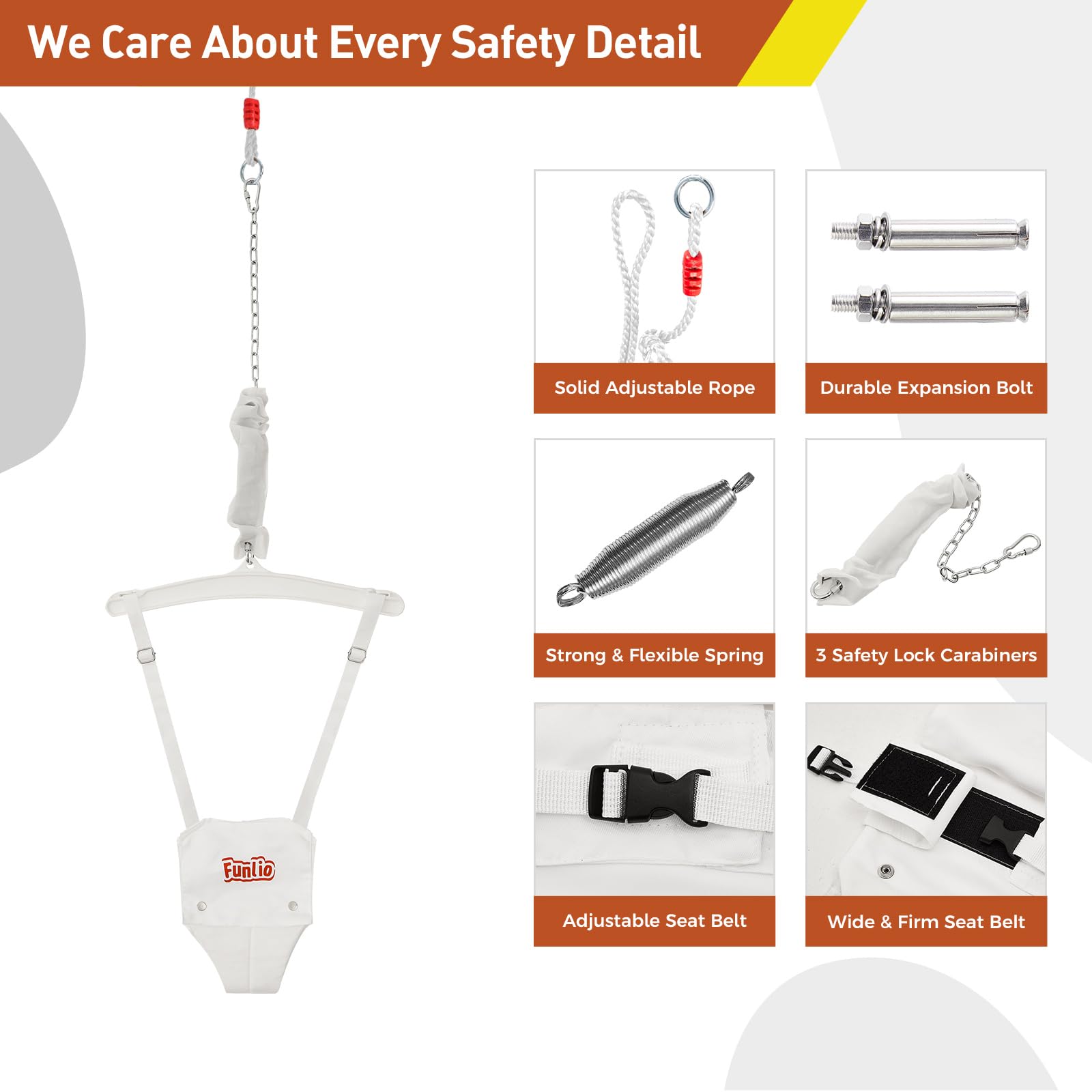 - Q: What is included in the package? A: The package includes the FUNLIO baby jumper, a stainless steel ceiling hook, two expansion bolts, and a safety extension rope.