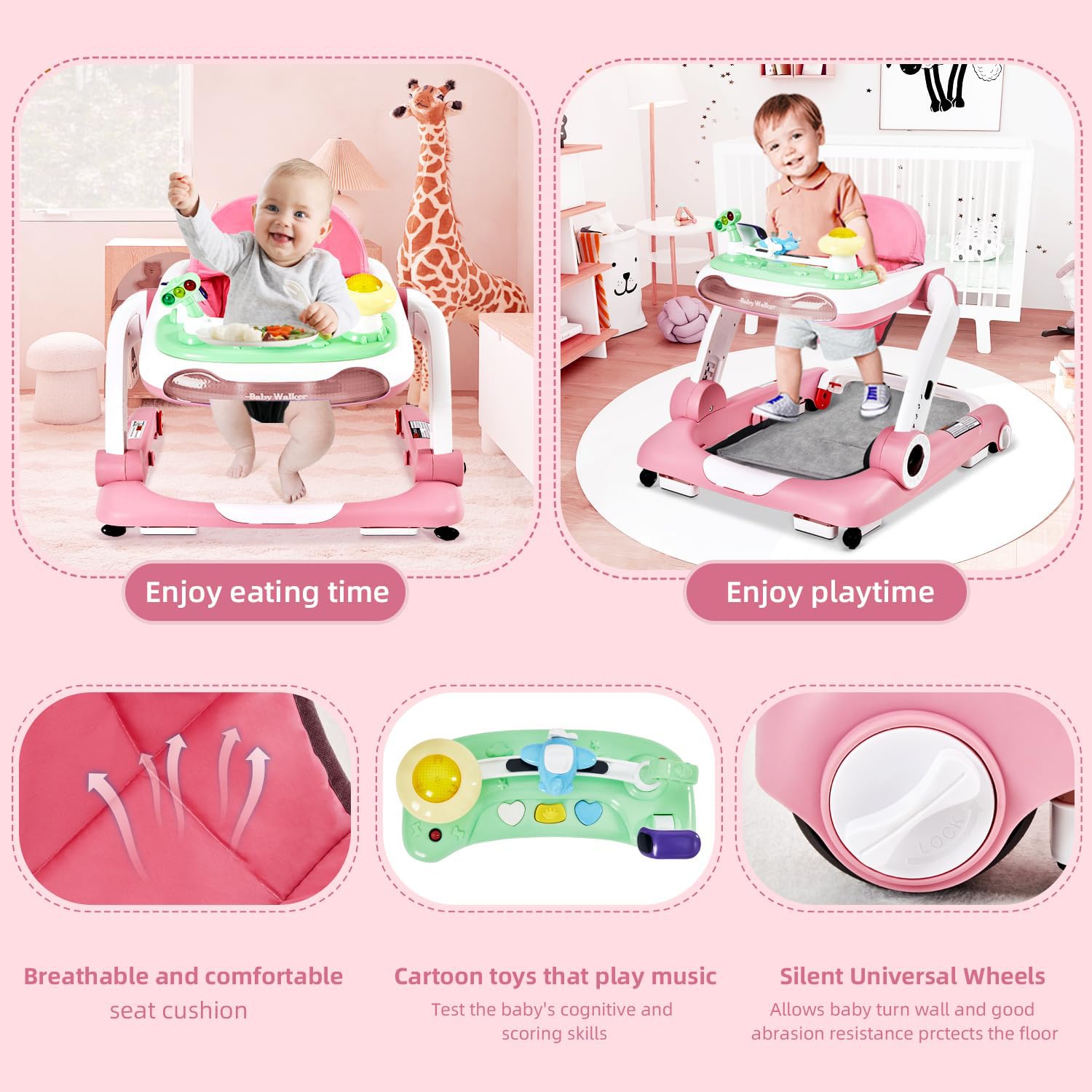 - Q: What features make this baby walker suitable for development? A: The walker supports physical development with its various modes and encourages motor skills through interactive toys.