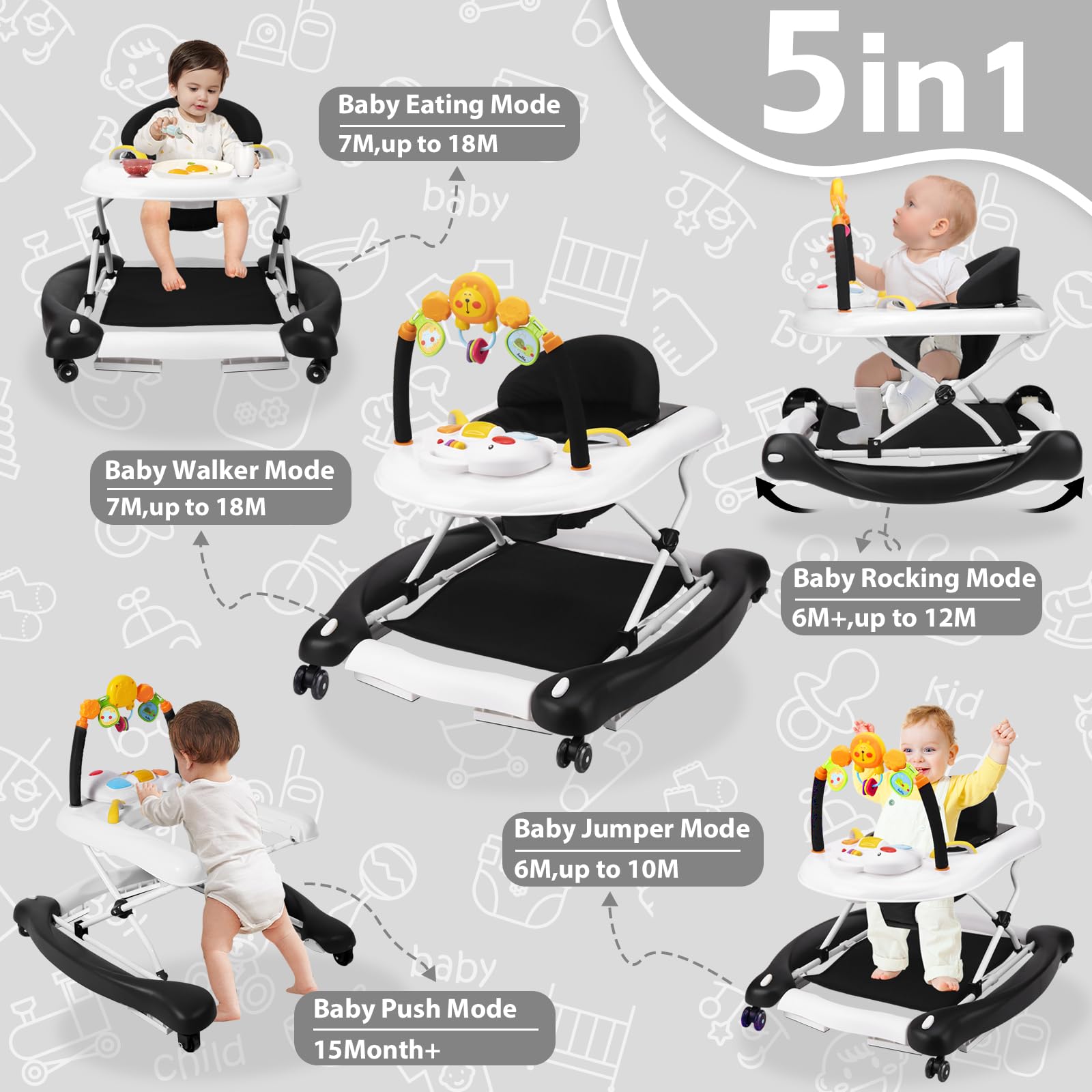 - Q: How many modes does this baby walker have? A: This baby walker features a 5-in-1 design that allows it to be converted into Walk mode, Bouncer mode, Rocking mode, Push mode, and Eating mode.