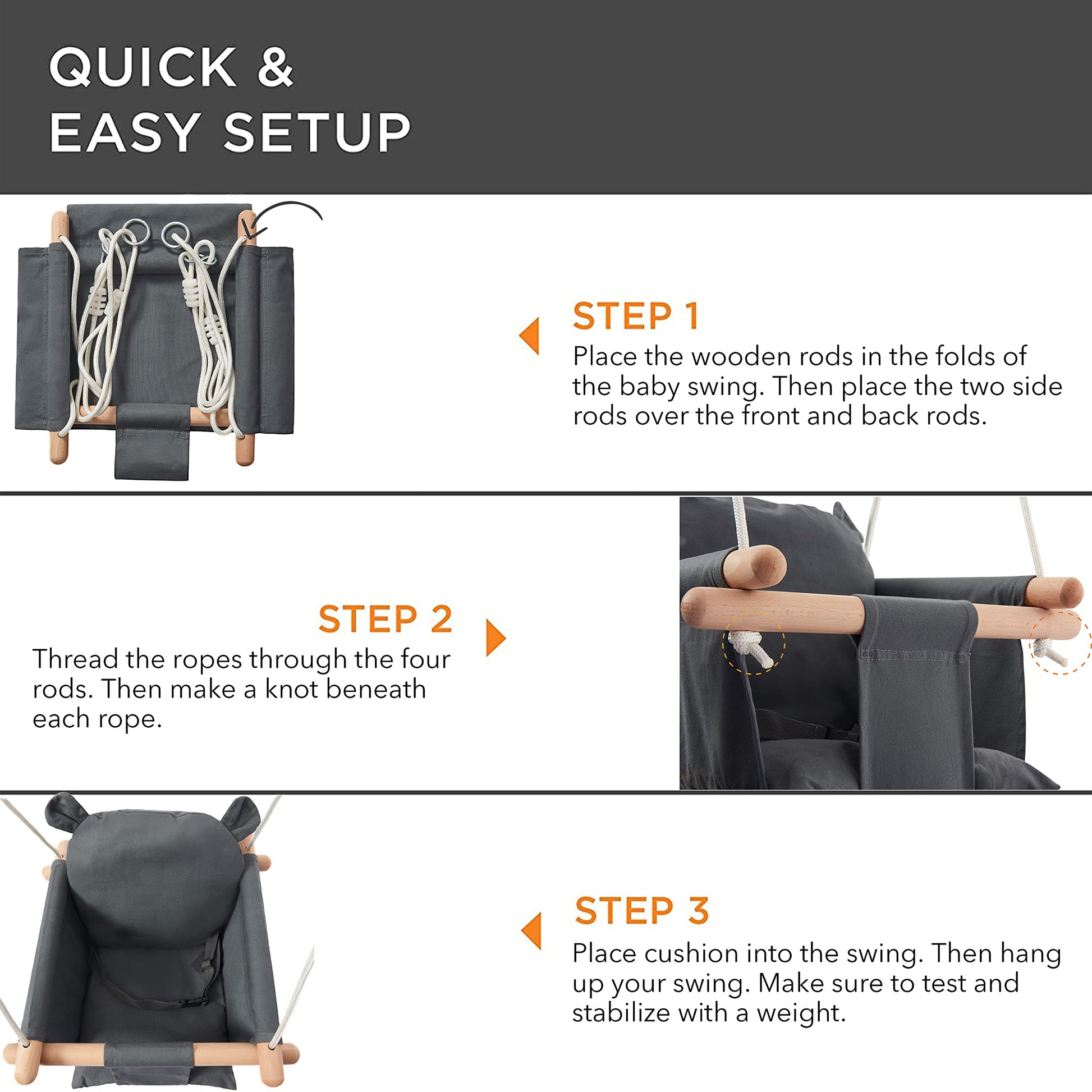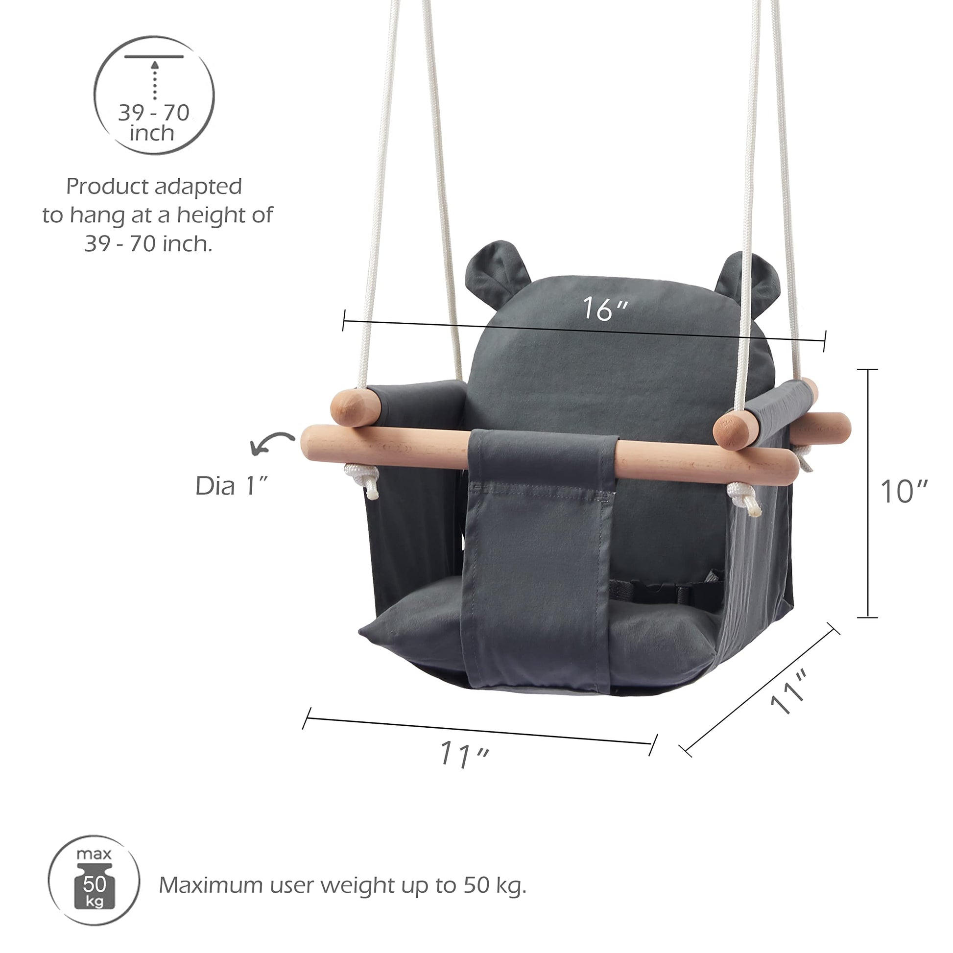 - Q: What materials are used in the swing's construction? A: The swing is made from 100% natural materials, including polished beechwood dowels, marine-grade polyester ropes, and double-layer canvas cotton.