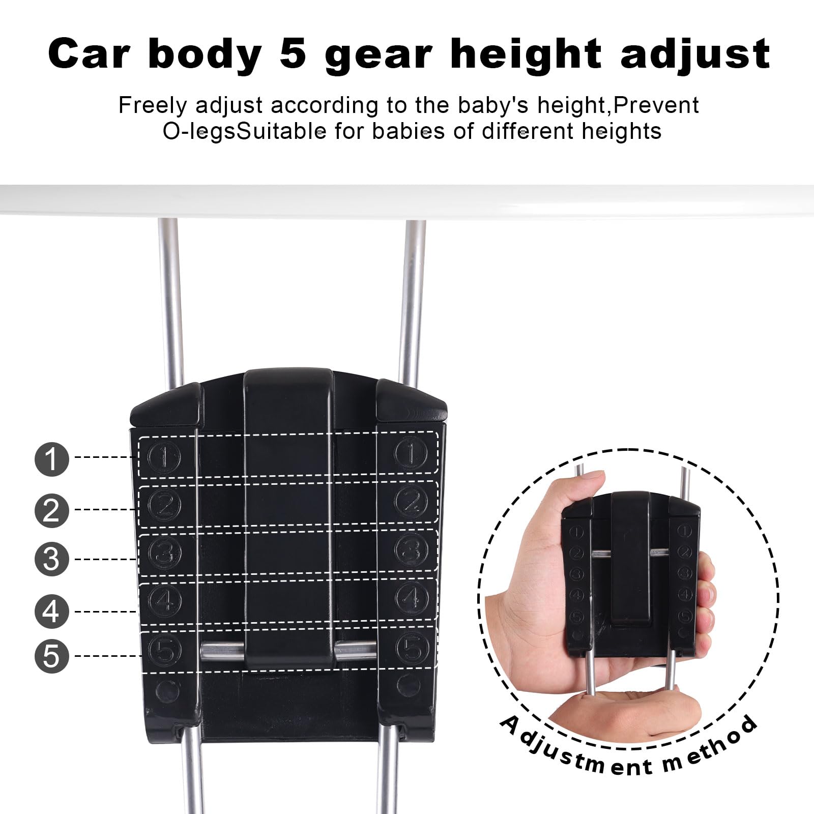 - Q: How adjustable is the height of the walker? A: The walker features five adjustable heights for the walker and four adjustable heights for the seat, allowing it to grow with your baby.