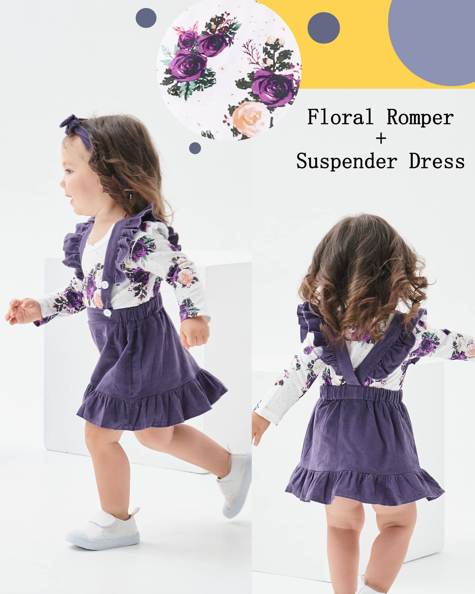 0-6 Months Baby girl clothes Toddler girl shirts Purple Suspender Skirt Set Long Sleeve Ruffle Romper Infant Jumpsuit Bodysuit Baby Overall Dress