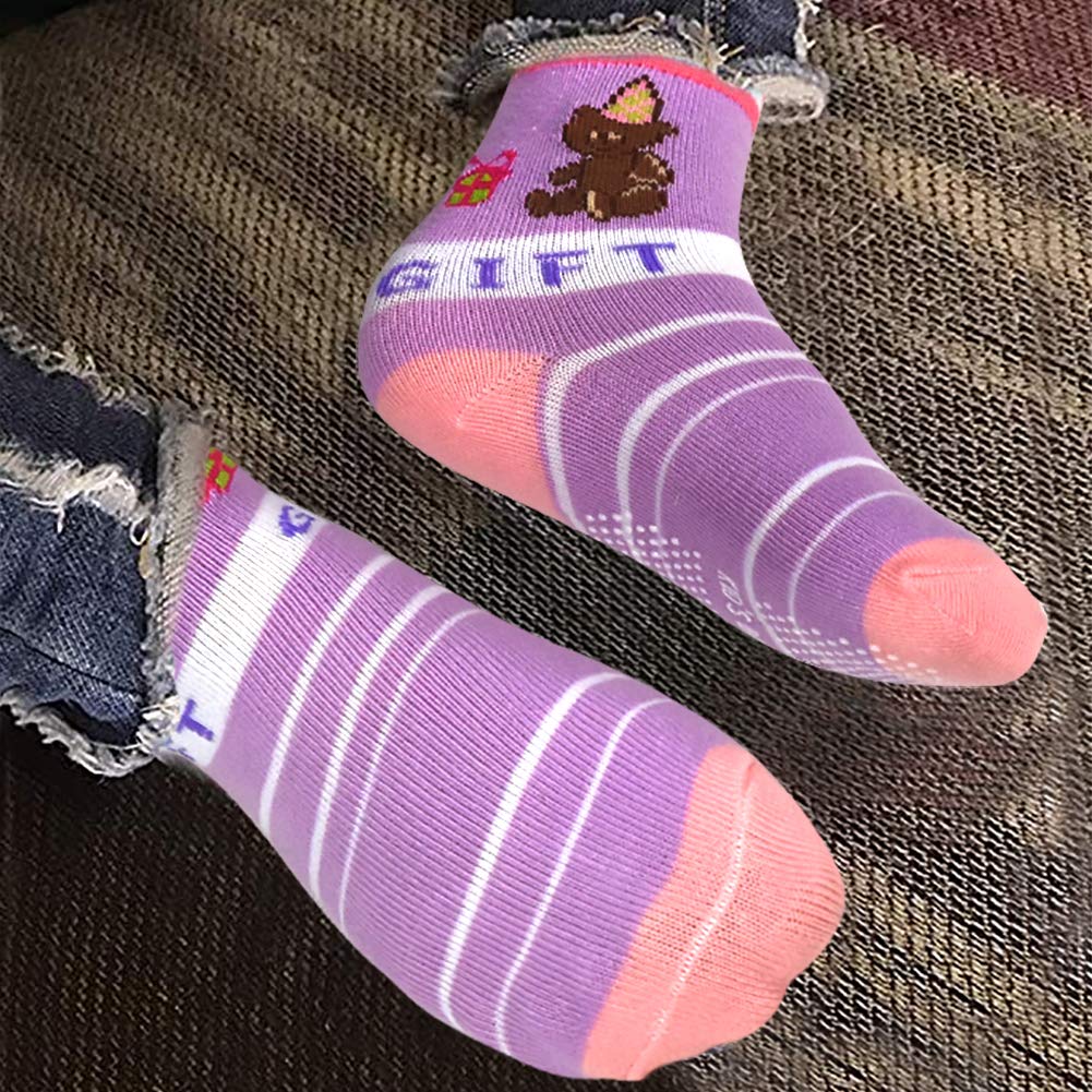 Tphon kids non slip socks are designed for babies these who are learning to walk or running Our Toddler Ankle grip Socks Baby Boy Anti Slip socks set features unique color and design combinations, which makes for a great Birthday gift for 12 month or 2t-3t 3t-4t 4t-5t 6t-7t Boys Ages 1-7 Advantage 1 Designed with Anti-slip dotted bottoms, Tphon baby socks prevent falls and slips from smooth marble or wooden floors 2 Select finest cotton material, these toddler grip socks have a breathable stretch fit that is soft on the skin and wont leave marks 3 Easy to get on and older toddlers are probably big enough to dress their little feet all by themselves, helping Mom out4 The kids non slip socks will keep little toes warm in style, suitable for spring, summer, autumn and winter5 Super cute socks is a perfect gift for your or friends baby on christmas, childrens Day, Birthday6 Pack of 12 non skid baby socks,sweat-absorbent, odor-resistant, anti slip and keep warm for your baby 7 The bright colors are sure to stimulate babies and draw their attention to those little toes Note:Please machine washes in cold water or water temperature not above 30Ac 80AF on the gentle cycle in mild detergent Please dont bleachdry clean, warm iron if needed, the water temperature under 30 when washing Package include: 12 pairs baby toddler walker anti slip socks with grips(Assorted cartoon pattern & fresh colors)