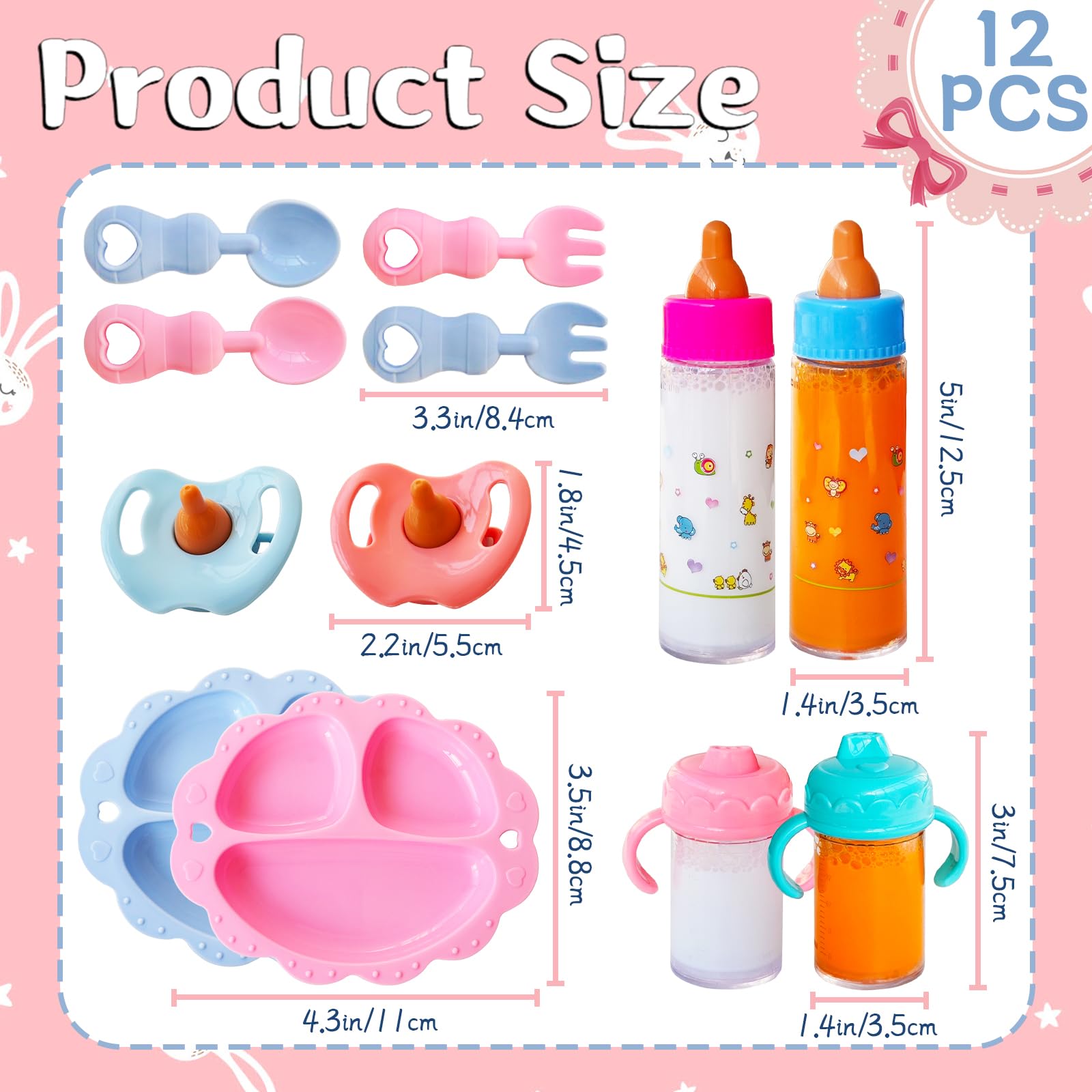 - Q: What is included in the 12 Pcs Baby Doll Accessories Magic Bottle set? A: The set includes 12 pieces: 4 magic milk and juice bottles, 2 doll pacifiers, 2 bowls, 2 spoons, and 2 forks, all packed in a pink storage bag.
