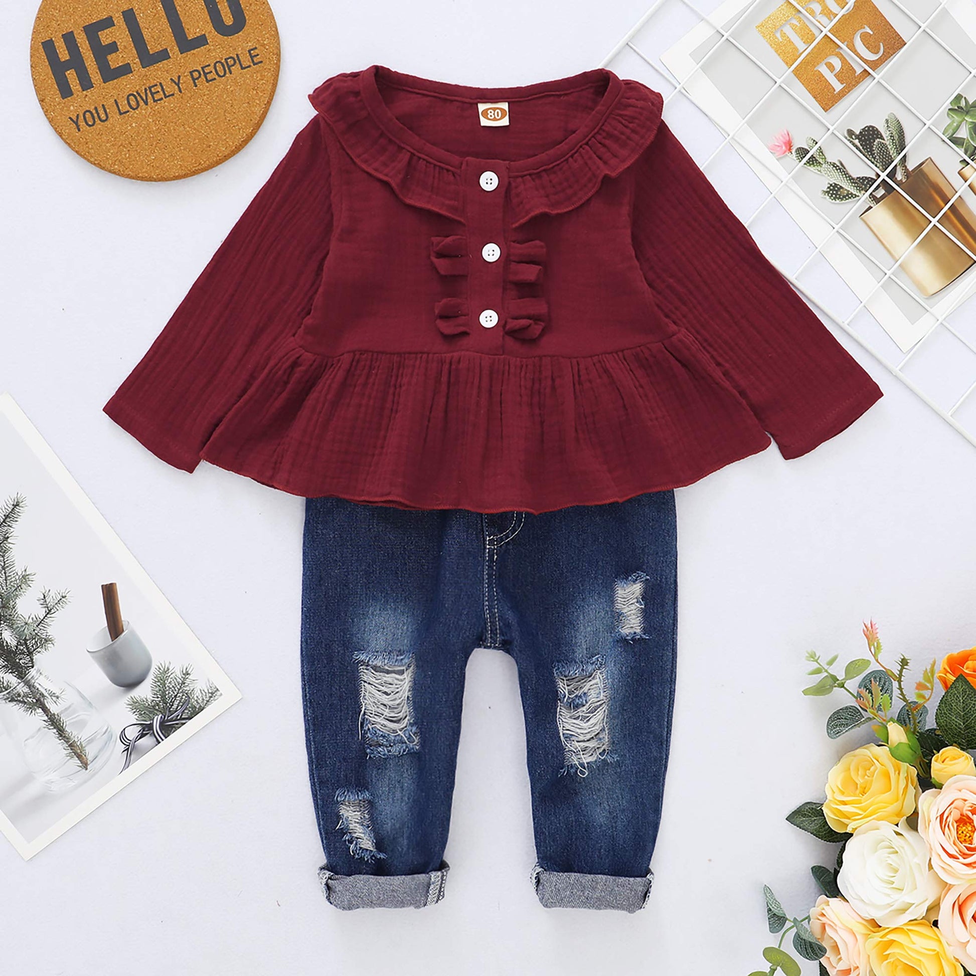 - Q: What makes this outfit fashionable for toddlers? A: The outfit features an adorable ruffle shirt and trendy ripped denim pants, making it cute and fashionable for little girls.