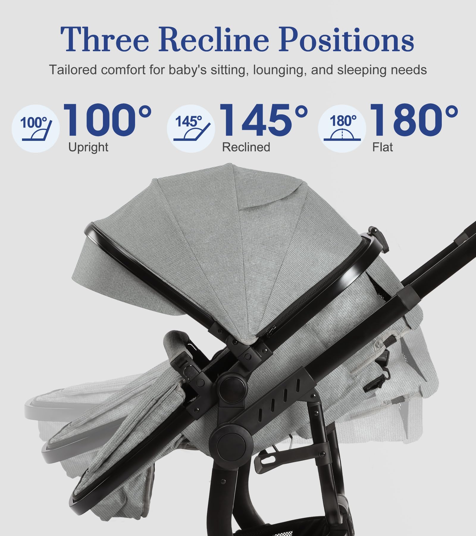 - Q: How many reclining positions does the stroller offer? A: The stroller provides three reclining seat positions: 100 degrees, 145 degrees, and 180 degrees, allowing your child to sit up, lounge, or lie flat for naps.