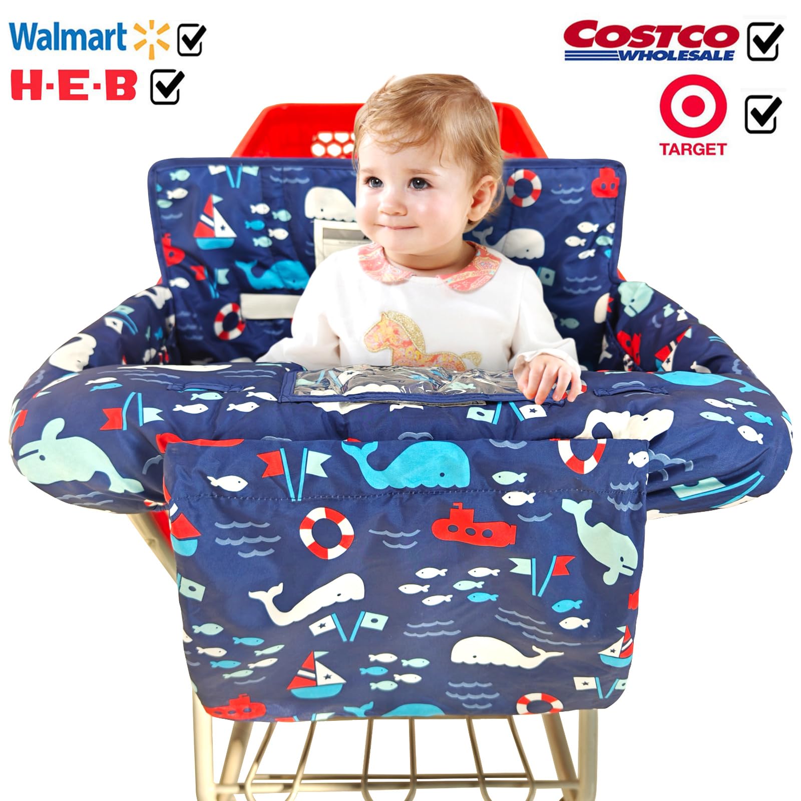 Superior protection -Completely covers entire surface area where your little one sits. This cover offer your little one a clean and comfortable seat on public shopping carts and high chairs. 2-in-1 feature- makes it a perfect buddy for grocery and restaurant use.Large and universal fit every shopping cart like Costco and Target cart.Functional accessories- 2 toy loops + 2 side pockets + 1 transparent phone caseStay organized - when our shopping cart cover is placed in seat, the front bag becomes a carrier that hangs over front handle bar to store your phone or keys.Easyfold awaymechanism - when you don't use it, the cover and pillow can be rolled into the front bag, easy to carry.Legs guard cover on the hole to protect your baby legs from scratching.Safety - complete with easy to secure straps that fasten cover to cart that secure baby to cover.Great baby shower gift idea.