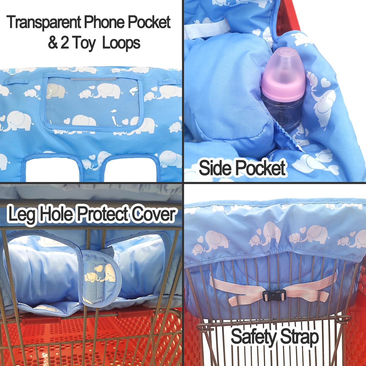 - Q: How does the 2-in-1 feature work? A: The 2-in-1 feature allows the cover to be used both as a shopping cart cover and a high chair cover, making it versatile for grocery shopping and dining out.