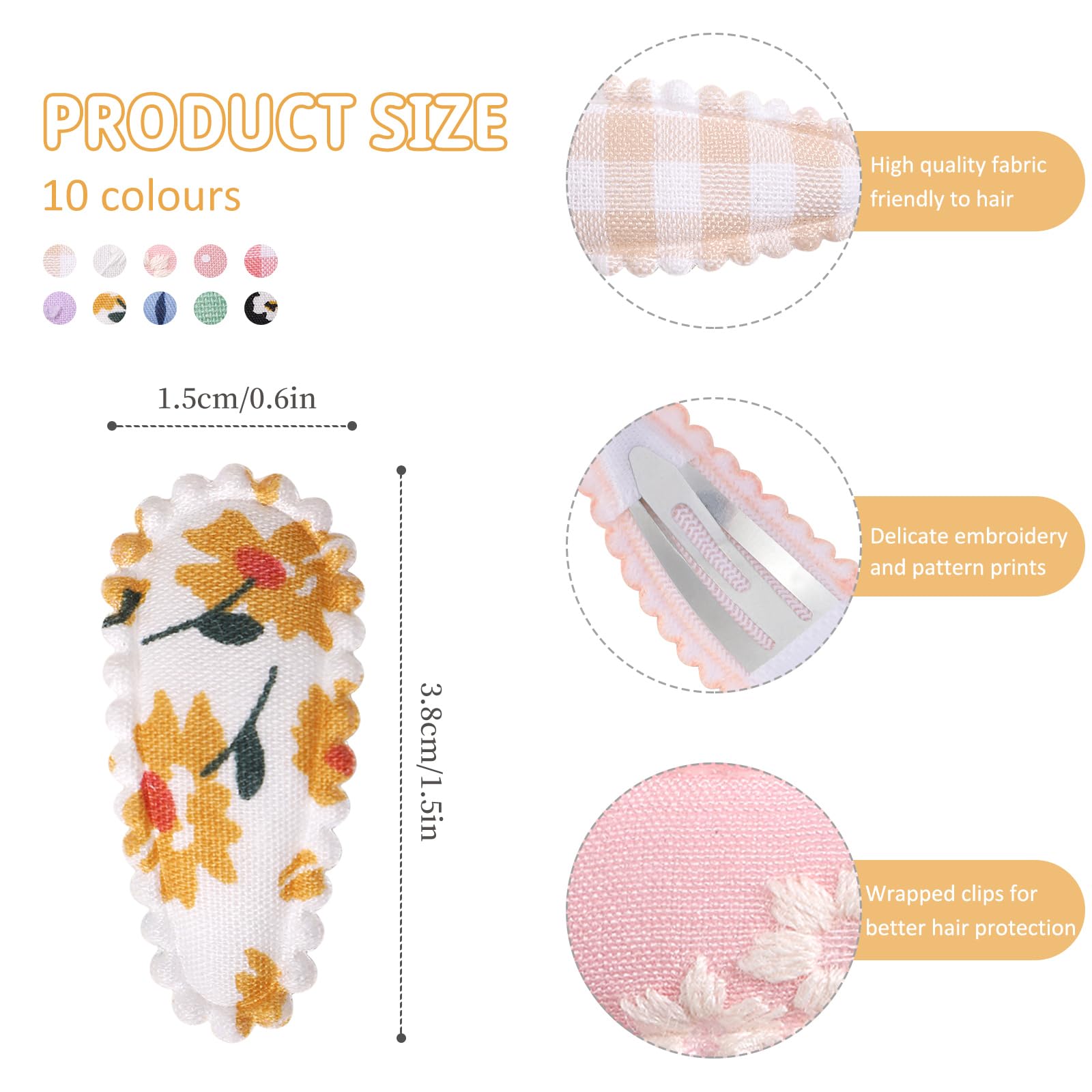 - Q: What colors are included in the 20 PCS Snap Toddler Hair Clips set? A: The set includes 10 different colors and patterns, with 2 pieces of each color.