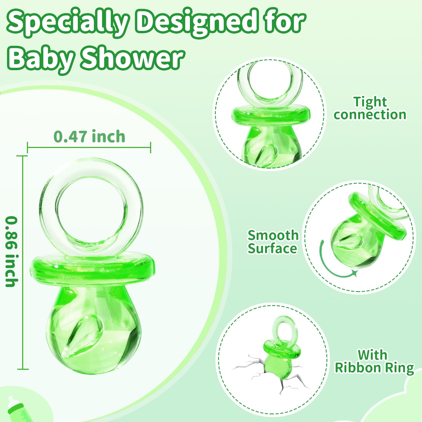 - Q: What occasions are these pacifiers suitable for? A: These pacifiers are perfect for baby showers, team games, and party table decorations.