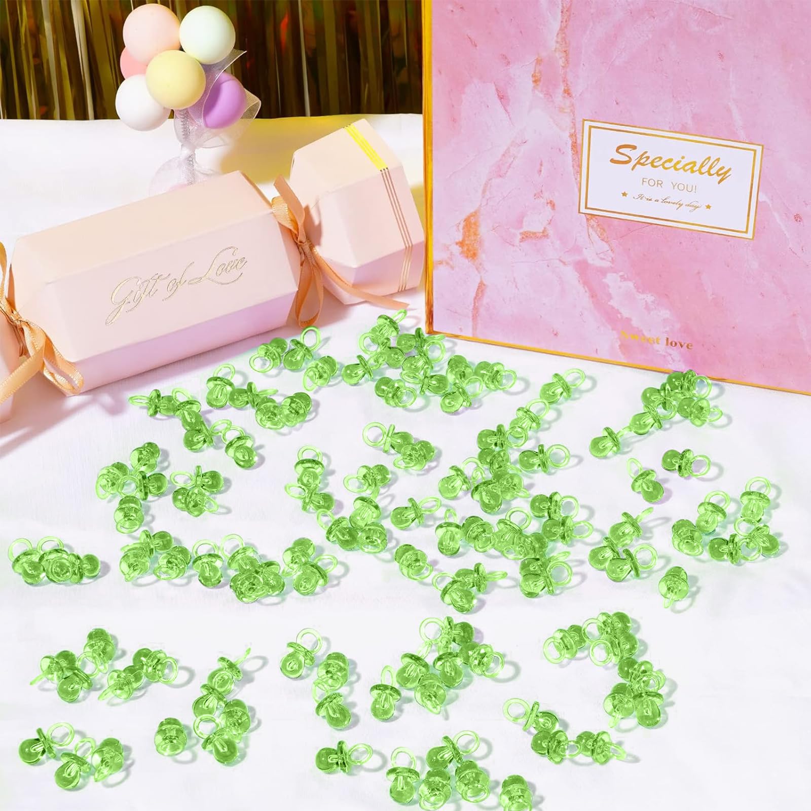 - Q: Can the pacifiers be used as table decorations? A: Absolutely! The clear baby pacifiers can be spread around the dining table as decorative elements to enhance the party atmosphere.