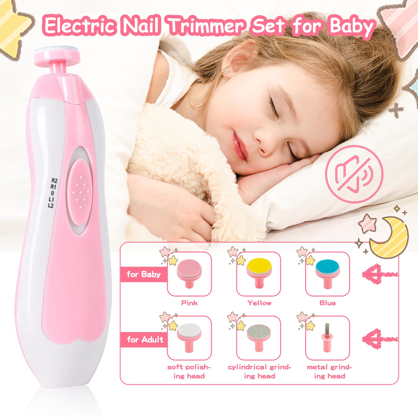 • Q: How does the electric nail trimmer work? A: The electric nail trimmer features an ergonomic design for easy handling and comes with six grinding heads. It operates quietly and allows for two-way rotation and two-speed regulation, making it easy to trim your baby's nails safely.
