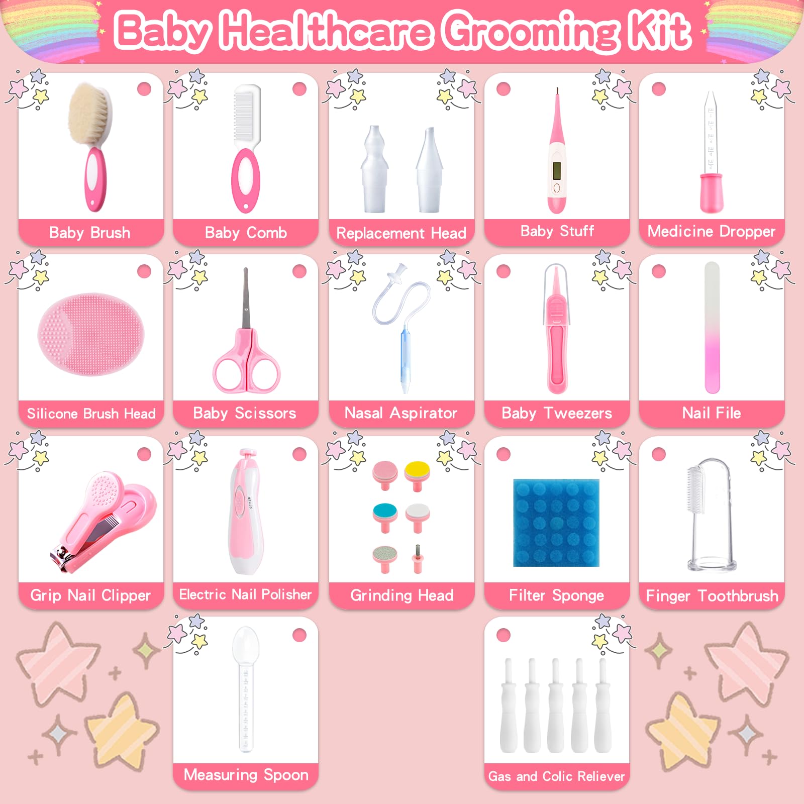• Q: What is included in the 28 in 1 Baby Healthcare and Grooming Kit? A: The kit includes a variety of essential items such as scissors, finger toothbrush, hairbrush, hair comb, medicine dropper, nasal aspirator, nail clipper, gas and colic relievers, and an electric nail trimmer, providing comprehensive care for your baby.
