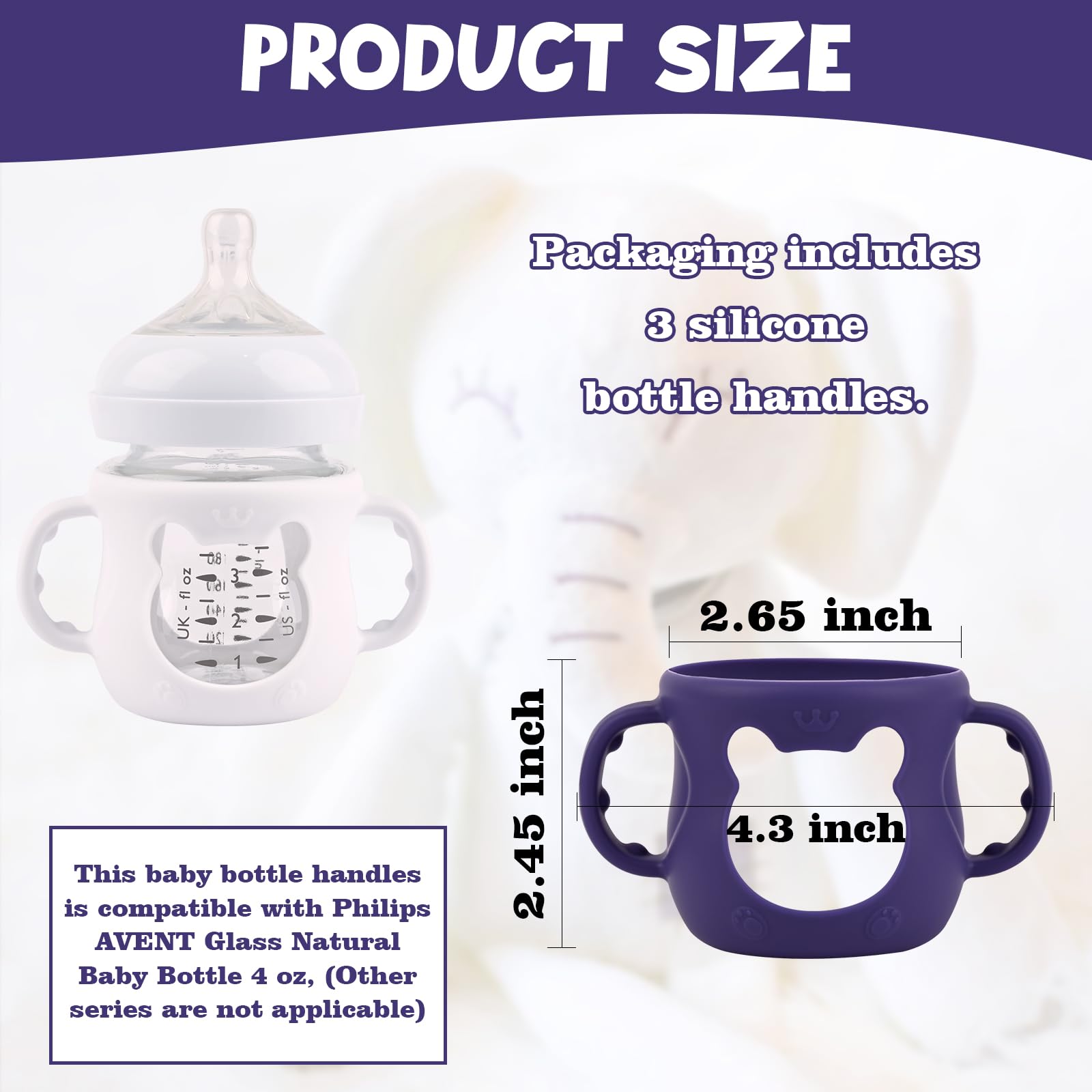 - Q: What are the dimensions of the Silicone Sleeves? A: The Silicone Sleeves are designed to fit the Philips AVENT Glass Natural Baby Bottle, specifically for the 4 oz size.