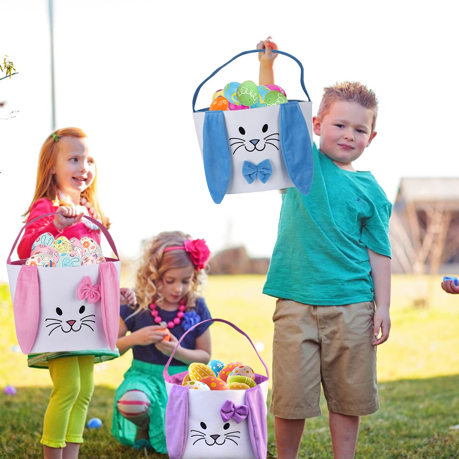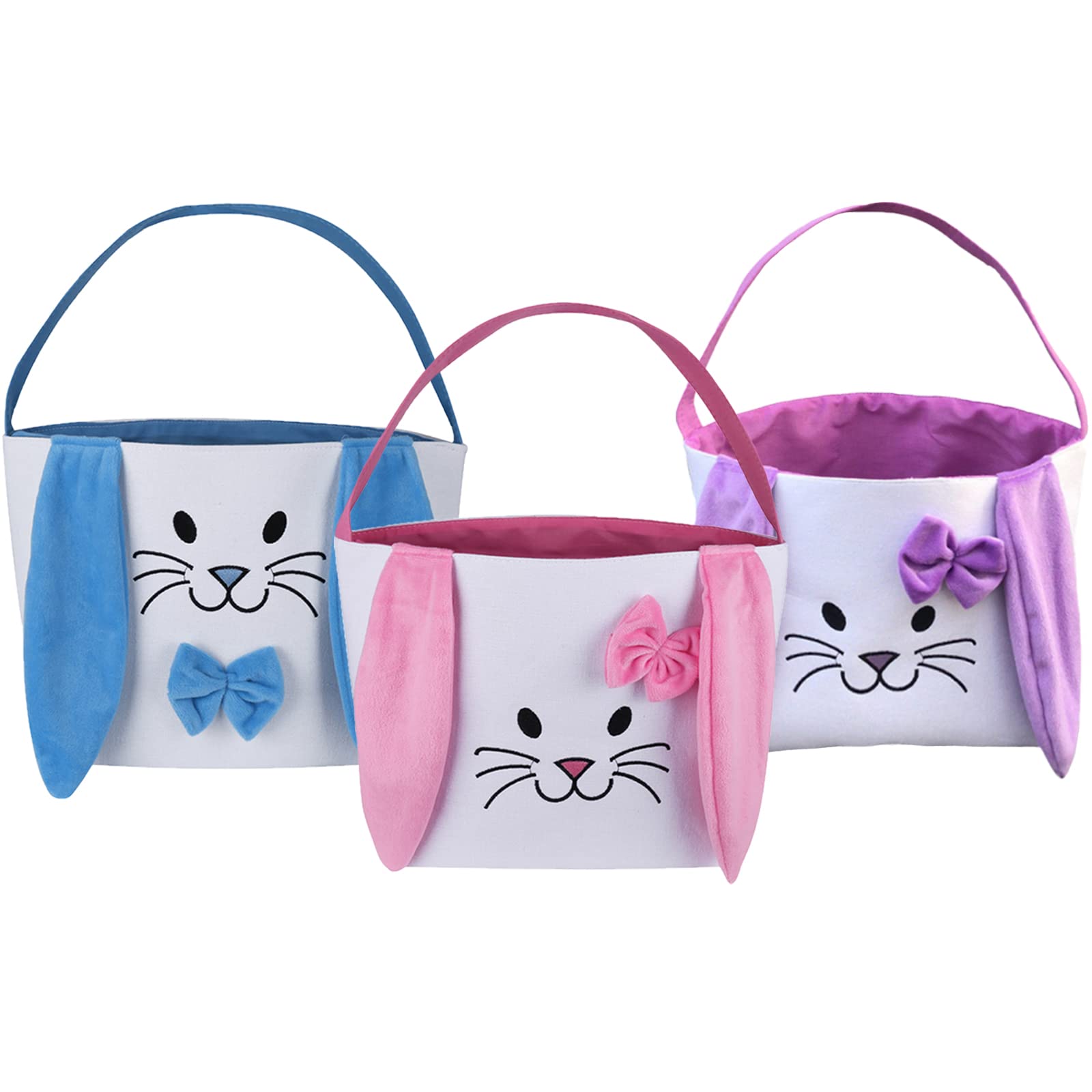 - Q: How many baskets are included in the package? A: The package includes 3 pieces of Easter bunny basket bags, each in a different color: purple, blue, and pink.