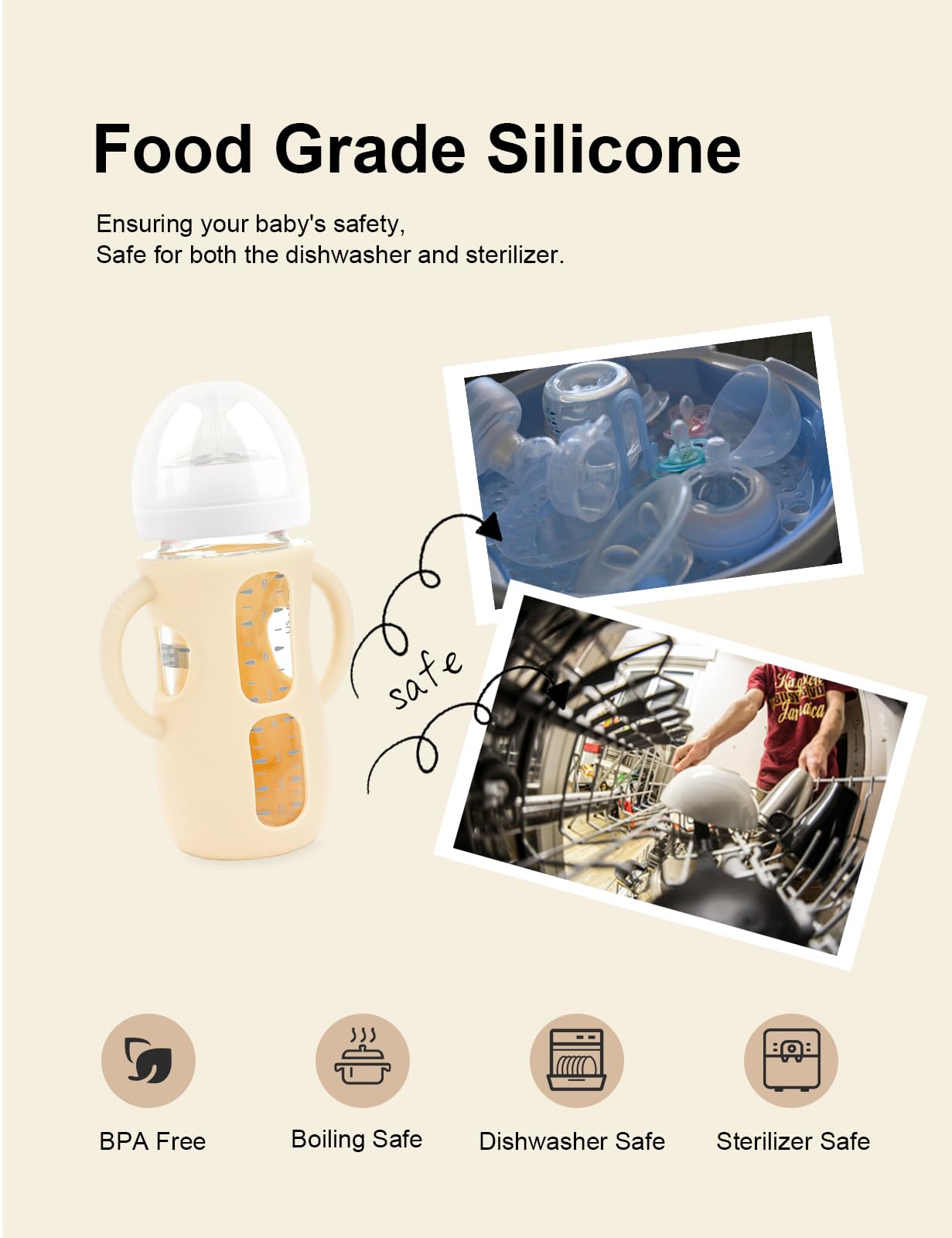 • Q: How do the handles help during feeding? A: The easy-grip handles allow babies to securely hold their glass bottles, helping to reduce the risk of drops and encouraging self-feeding.