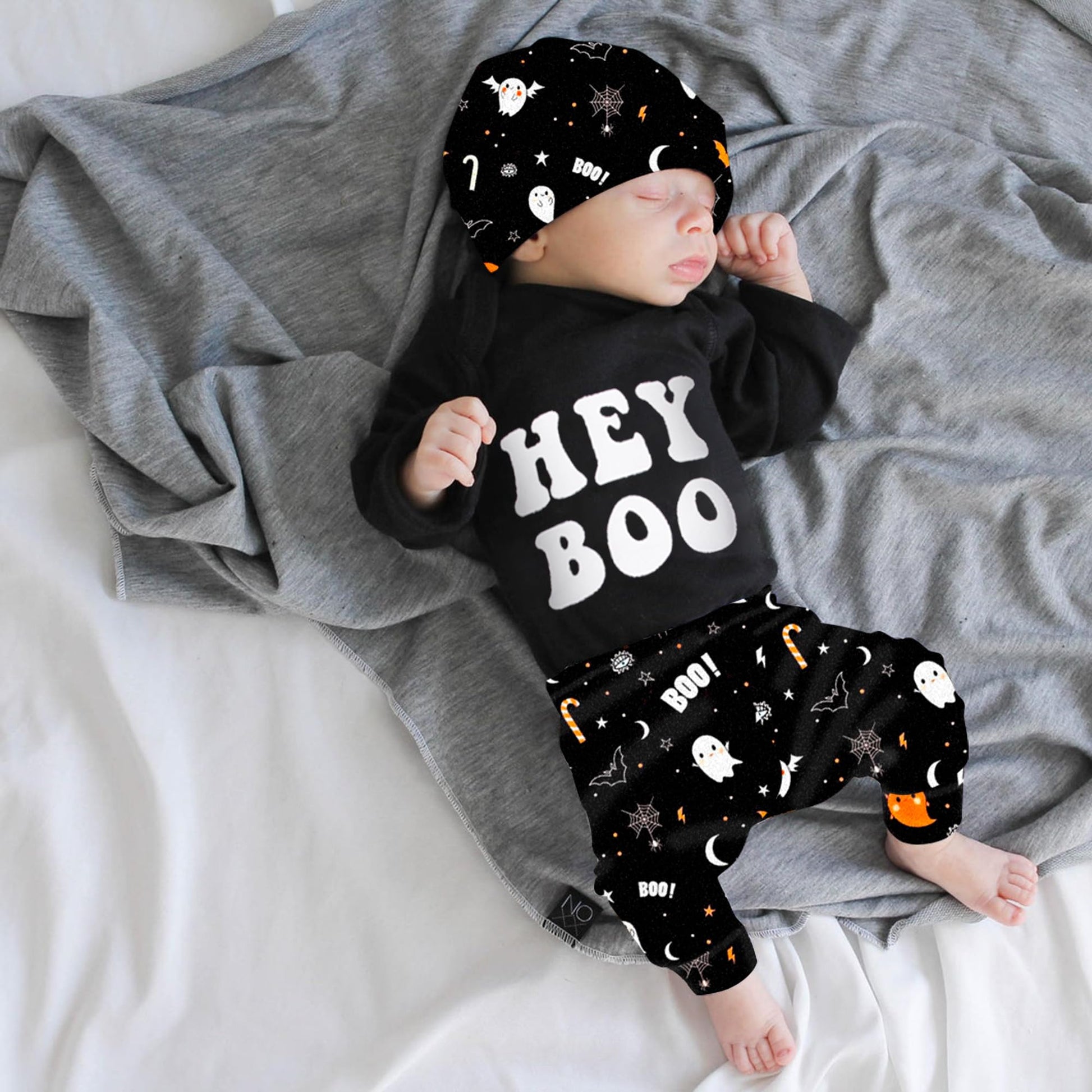 - Q: What is the design theme of the outfit? A: The costume features a fun Halloween theme with a 'HEY BOO' print on the onesie and ghost and bat patterns on the pants, creating an adorable look for your baby.