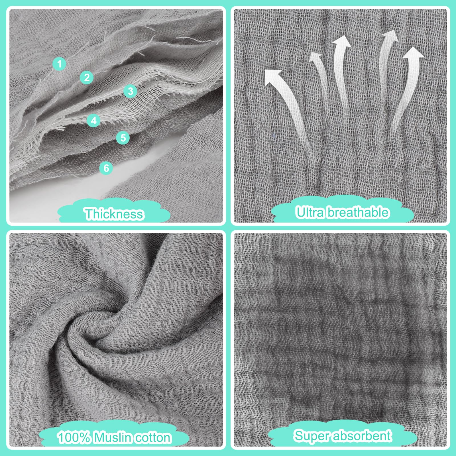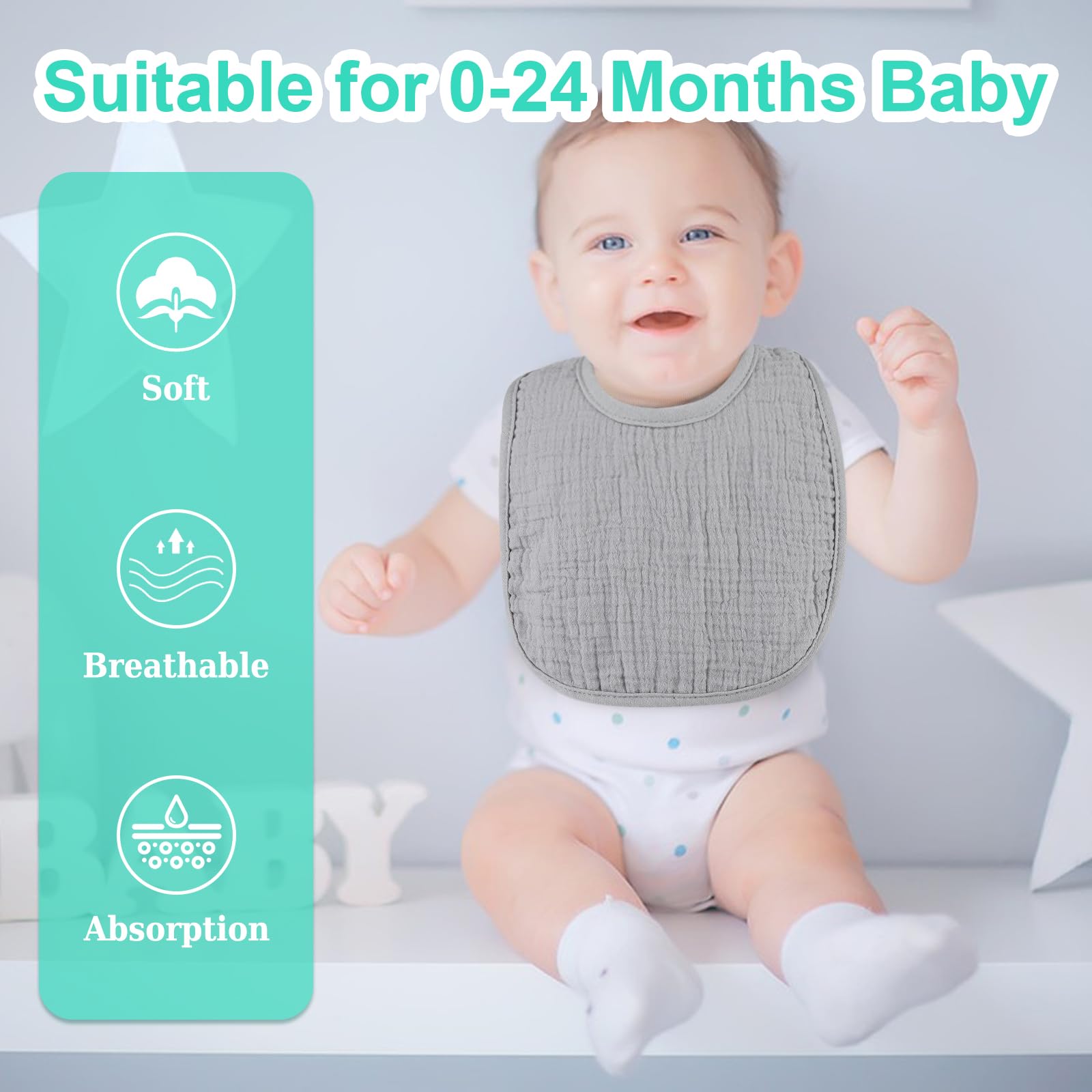 - Q: Are these bibs effective for teething and drooling? A: Yes, these bibs are super absorbent with six layers of soft muslin cotton, designed to effectively catch and soak up liquid from spills, spit-ups, and drooling.