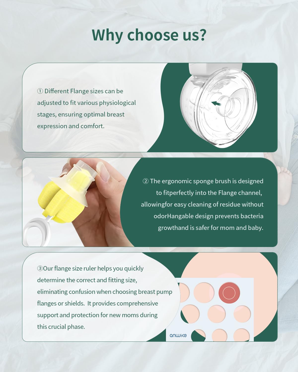 - Q: Does the kit help improve pumping efficiency? A: Yes, selecting the right flange size promotes optimal pumping efficiency and comfort during breastfeeding sessions.