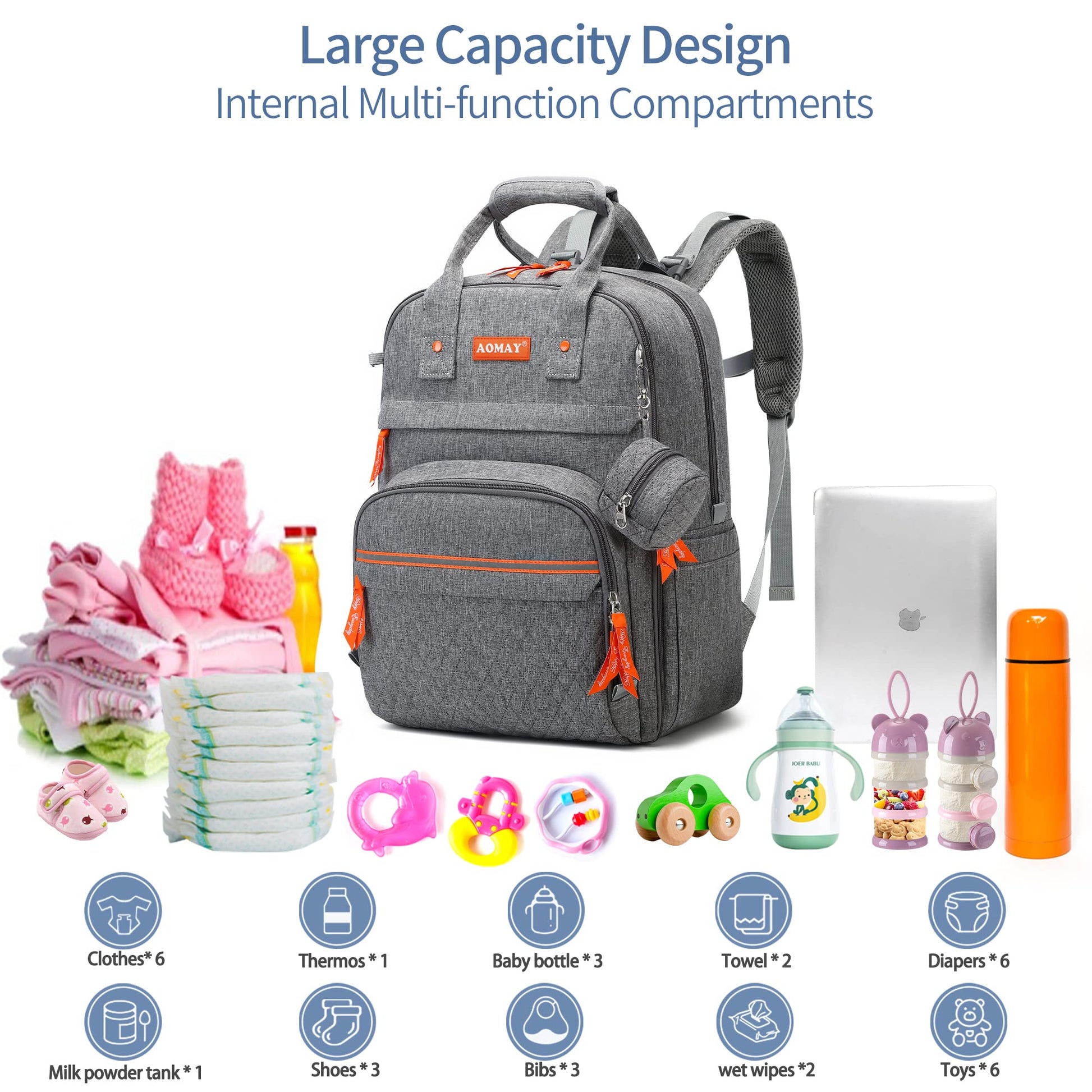 - Q: What is the capacity of the AOMAY Baby Diaper Bag Backpack? A: The AOMAY Baby Diaper Bag Backpack has a large capacity with two big zipper closure compartments and 14 pockets, making it spacious enough to hold most baby essentials.