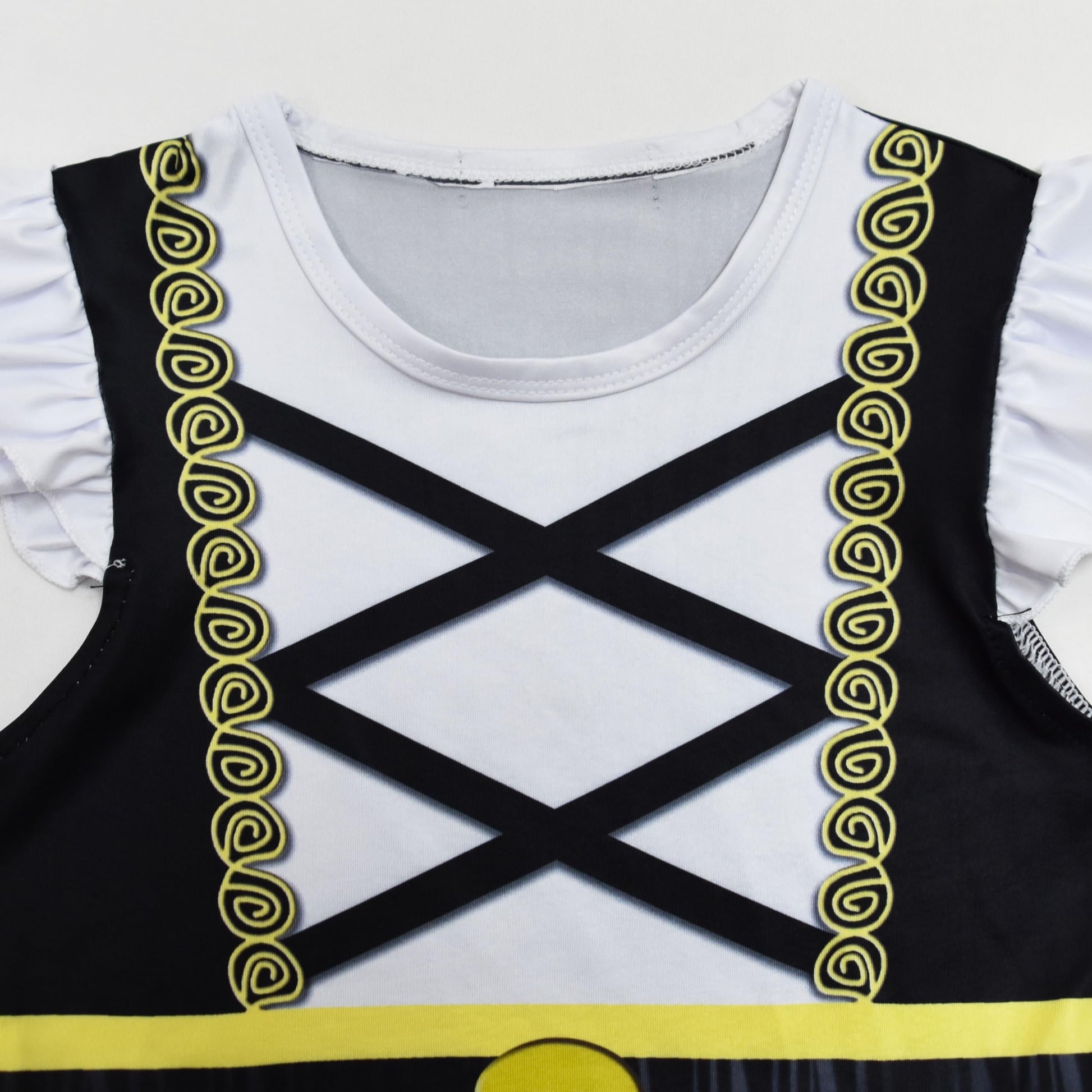 - Q: Does the dress have any special features? A: Yes, it features cartoon prints, adding a fun element to the costume.