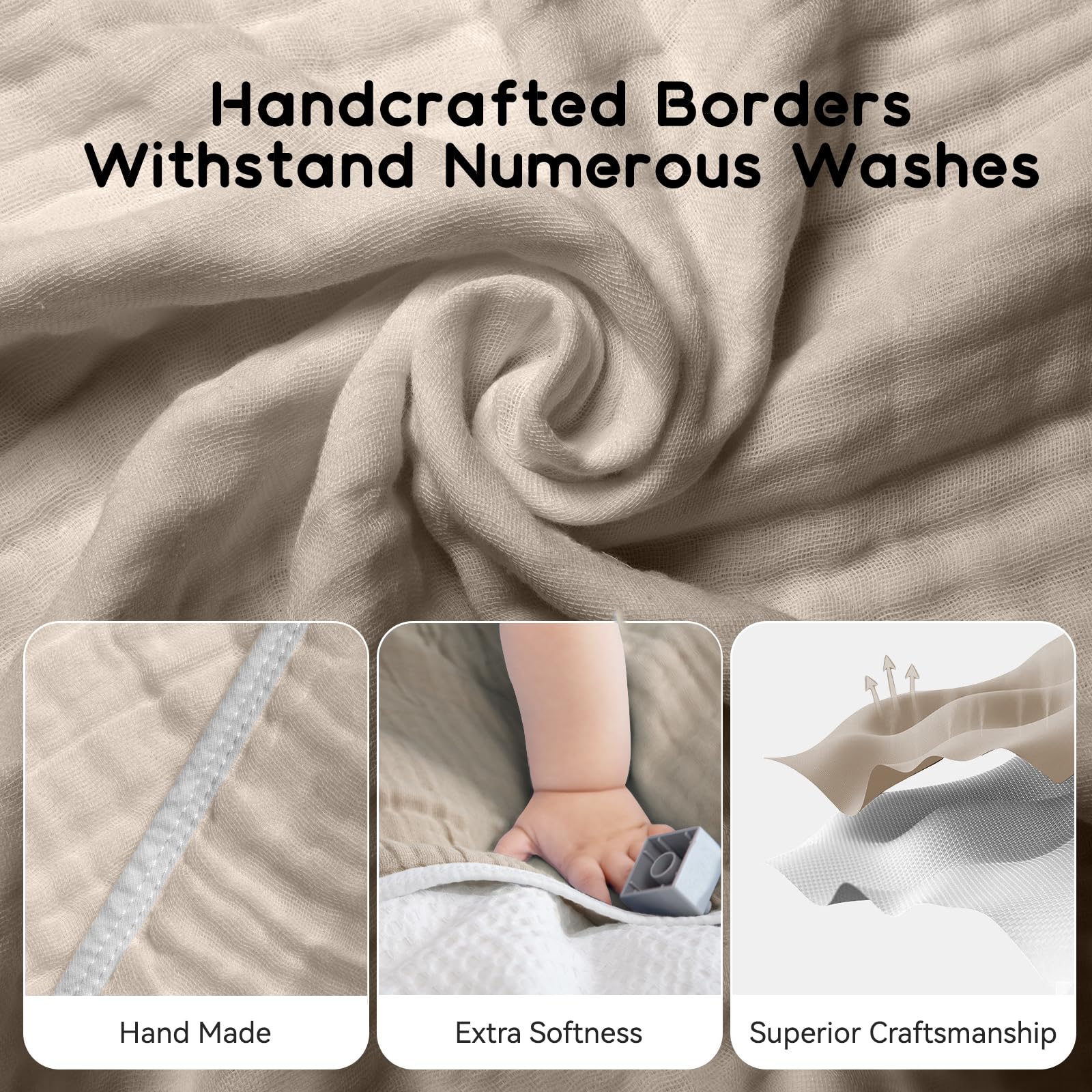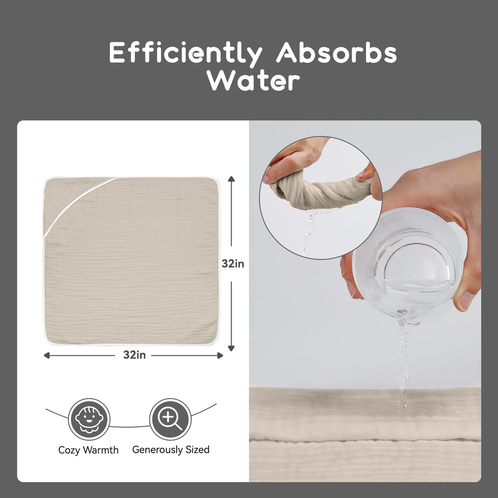 Supreme Softness& No Lint: Experience the tender touch of 100% premium muslin cotton that won't leave behind lint or fuzz, perfect for your baby's sensitive skin.Expansive &Growth-Friendly: The baby hooded towels are thoughtfully sized at 32x32 inches, designed to provide ample coverage for newborns and to stay suitable up to the playful toddler years.Exceptional Absorbency & Warmth: The baby hooded towels are crafted with a plush six-layer weave, these baby hooded towels quickly wick away moisture and envelop your child in warmth after bath time or swimming lessons.Lasting Quality& Care: Wash after wash, our hooded towels maintain their softness and structure, offering you a long-lasting, easy-to-maintain essential for your babys comfort.Multifunctional Comfort: Beyond drying off, our versatile hooded towel doubles as a snugly blanket or a convenient burp rag, ensuring your baby stays cozy wherever you are.