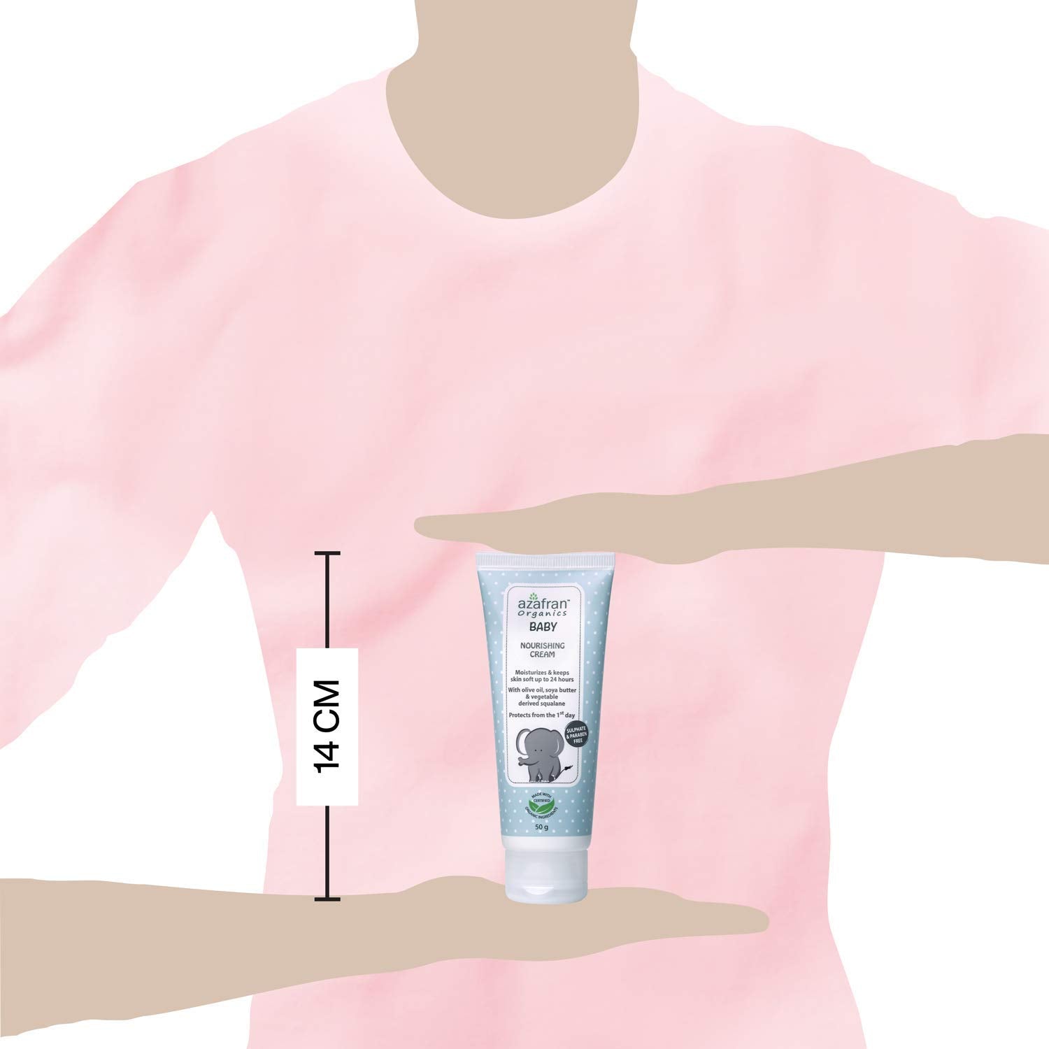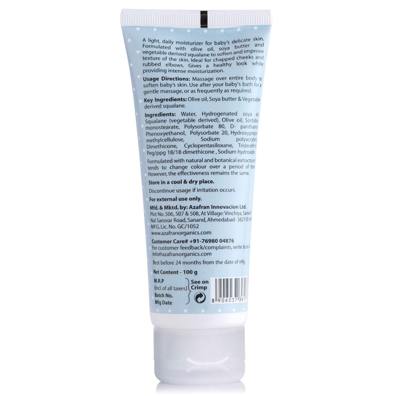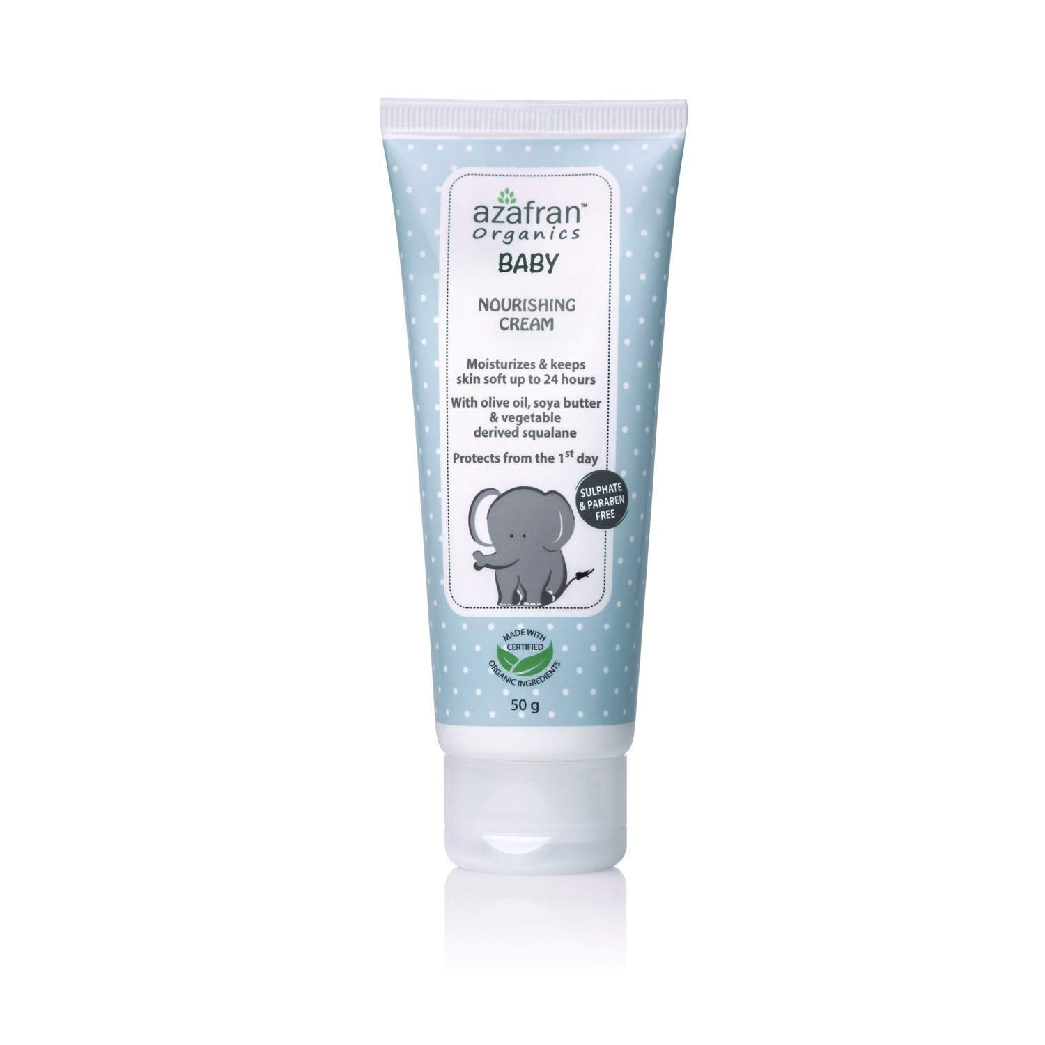 - Q: What are the main ingredients in Azafran Organics Baby Nourishing Cream? A: The main ingredients include organic Olive Oil, Soya Butter, and vegetable-derived Squalane, all designed to nourish and protect baby's delicate skin.