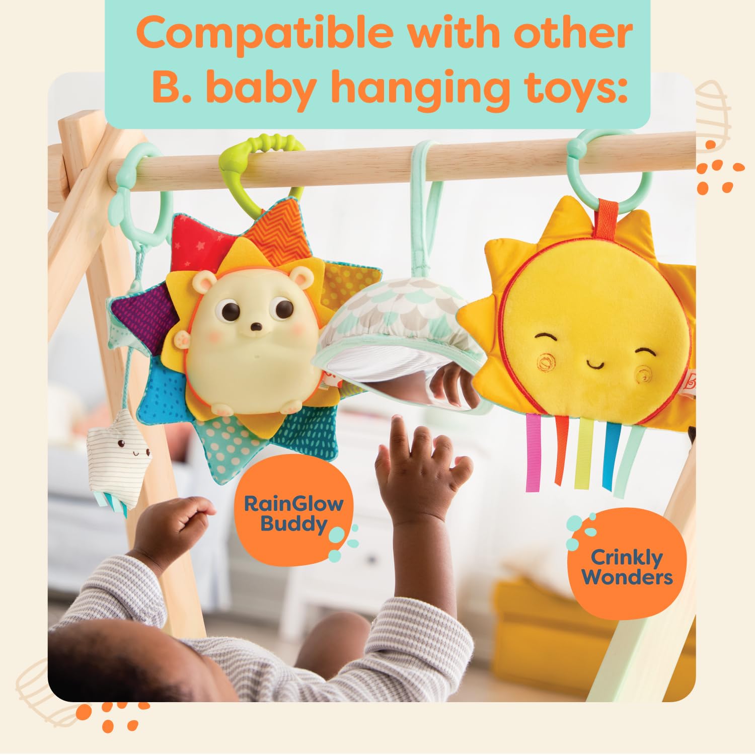 - Q: Are the hanging toys removable? A: Yes, the B. baby Wooden Baby Play Gym includes three removable accessories: fabric stars, a cloud-shaped mirror, and textured beads, allowing for versatile play options.