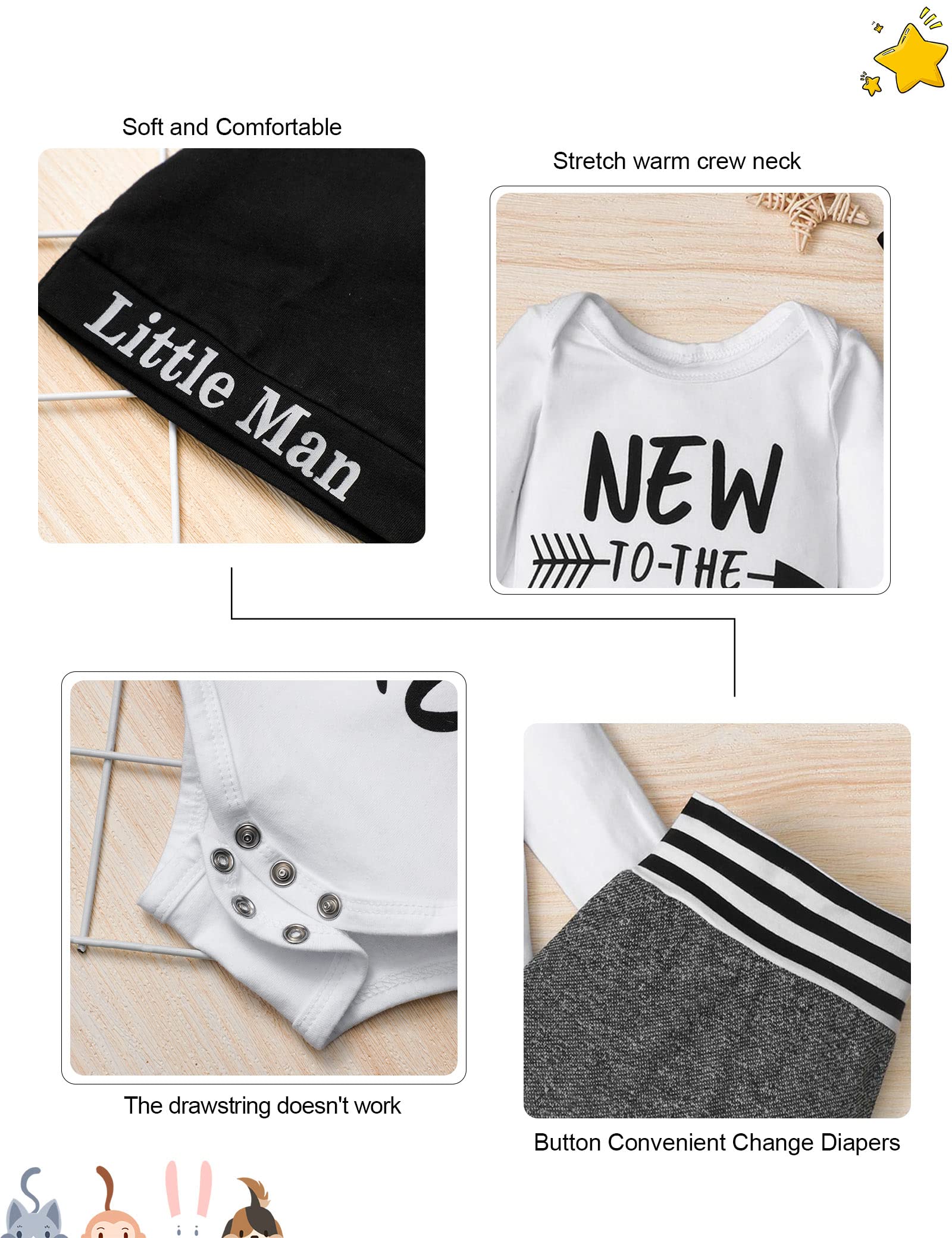 - Q: What unique designs are featured in the Baby Boy Outfits? A: The Baby Boy Outfits feature fun letter print designs such as 'New to the Crew', 'Little Brother', 'Mama's Boy', and 'Daddy's Little Dude', along with a classic round neck romper and striped patchwork pants.