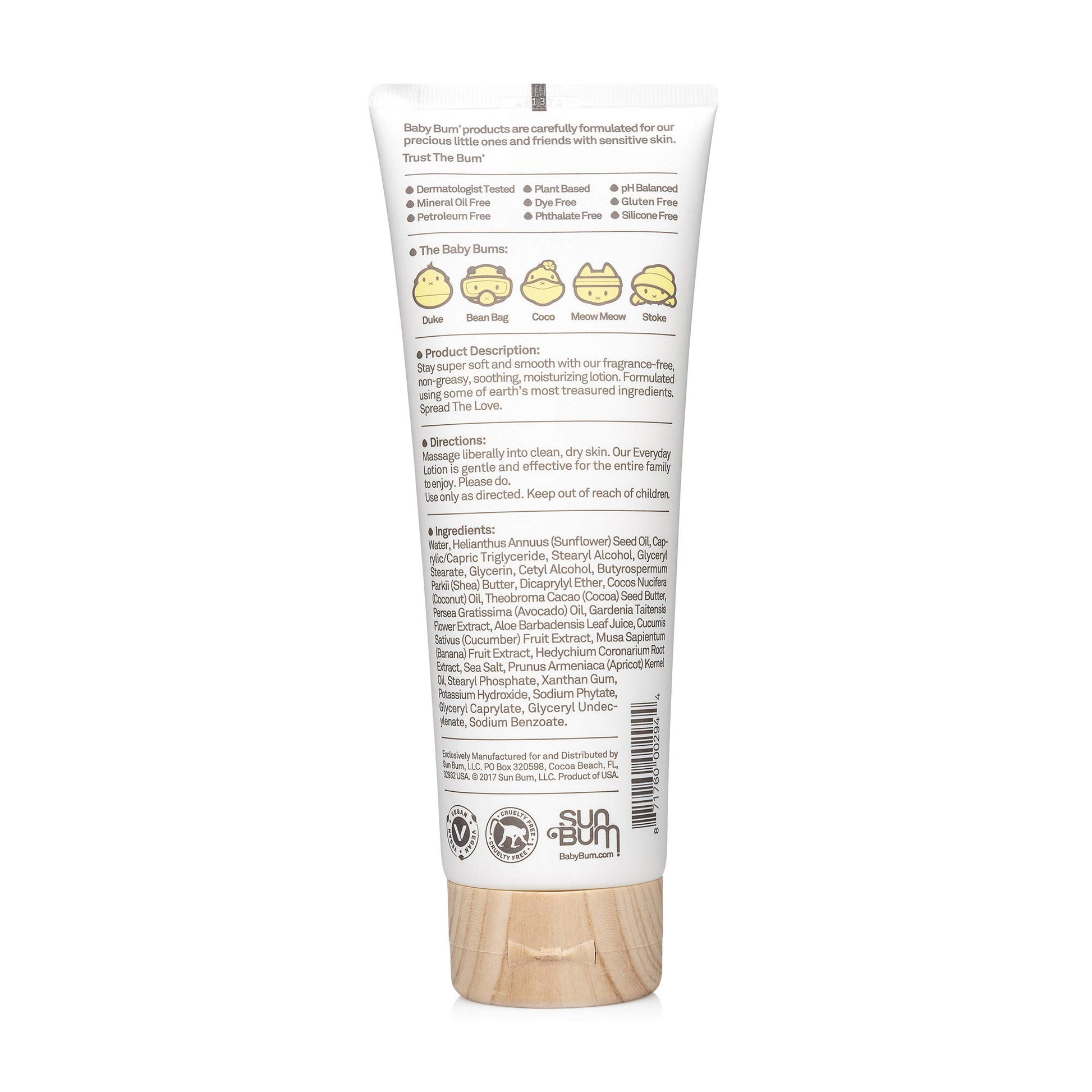 - Q: What ingredients are in Baby Bum Everyday Lotion? A: The lotion includes plant-based ingredients such as coconut oil, avocado oil, and aloe, which are known for their moisturizing and soothing properties.