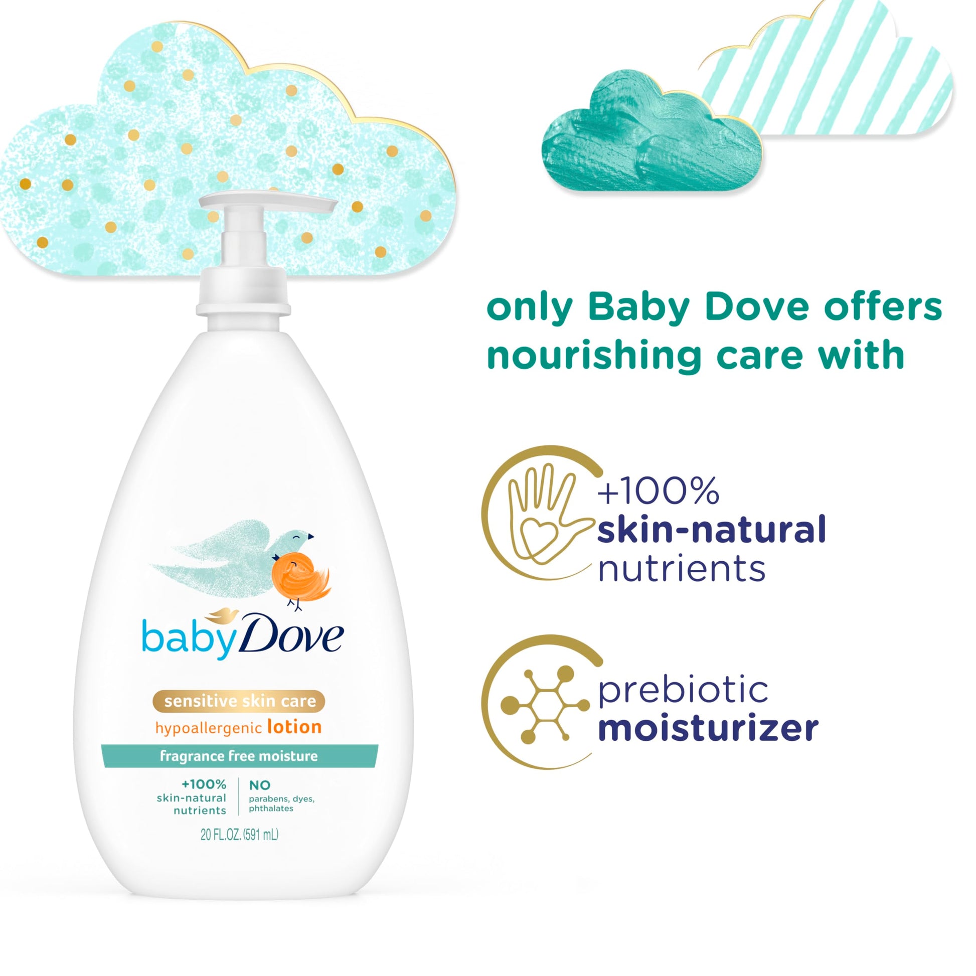 The best lotion for babies should give the gentle, nourishing care their delicate developing skin needs. Bathing can lead to skin dryness, so use fragrance free Baby Dove Sensitive Moisture Lotion afterward to help replenish the essential moisture and nutrients in your babys skin. Made with 100 percent skin-natural nutrients, Baby Dove Sensitive Moisture Lotion helps moisturize and replenish your babys precious skin barrier for up to 24 hours, leaving babys skin soft. From the very first use, this baby body lotion soothes and hydrates to help baby's skin retain its natural moisture. This baby lotion is dermatologist and pediatrician tested so you can feel reassured that your babys skin is getting the extra special care it deserves. Plus, the gentle, hypoallergenic and pH-neutral formula of our baby body lotion is suitable to use even on your newborn. Baby Dove Sensitive Moisture Lotion is also suitable for eczema prone skin. Use Baby Dove Sensitive Moisture Lotion after bathing your baby with Baby Dove Sensitive Moisture Tip to Toe Wash. Warm Baby Dove Sensitive Moisture Lotion in your hands, then apply to your babys skin and massage to moisturize your little ones delicate skin while leaving it super soft. And if you love our products, let us know by leaving a review!