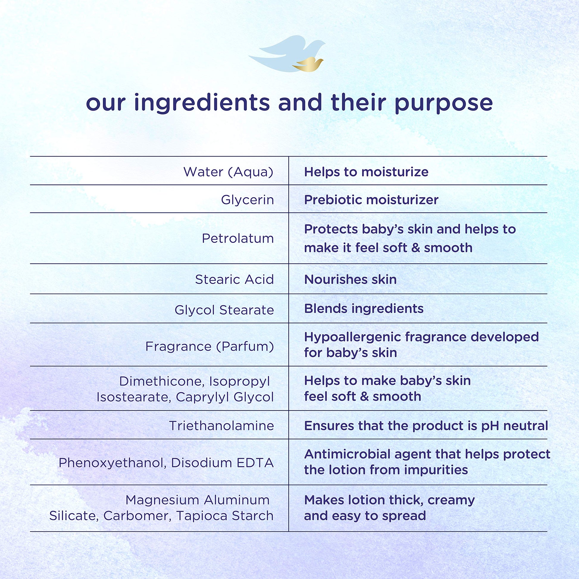 - Q: Are there any harmful ingredients in Baby Dove lotion? A: No, Baby Dove Rich Moisture Body Lotion is formulated without dyes, parabens, or phthalates, ensuring a safe and gentle experience for your baby's skin.