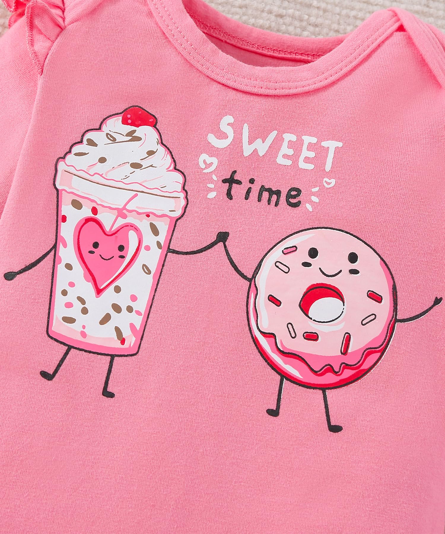 - Q: What print design does the outfit feature? A: The outfit features a playful 'Sweet Time' print with adorable cupcake and donut characters, adding a fun touch to your baby's wardrobe.