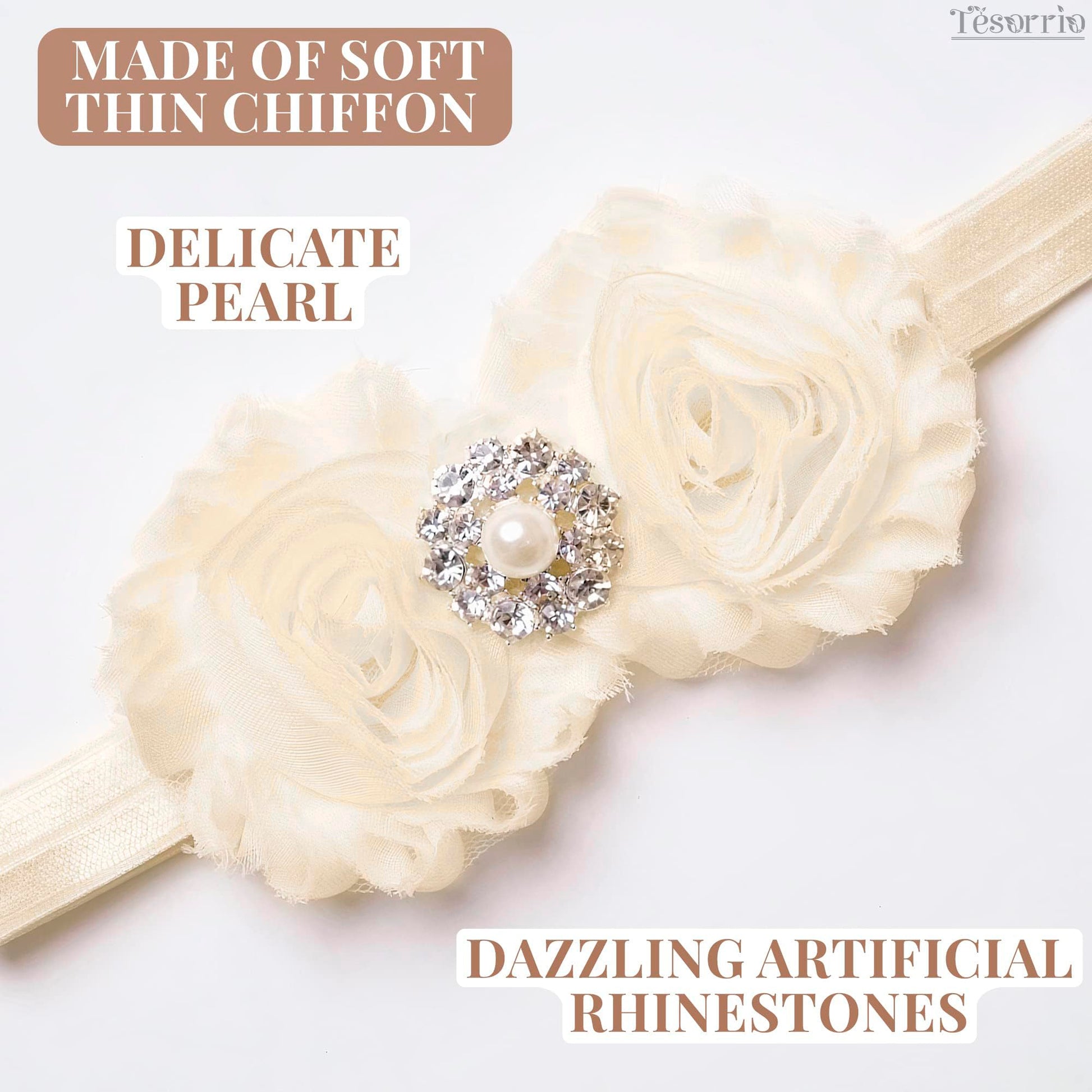 - Q: What materials are used in the Baby Girl Flower Headband? A: The Baby Girl Flower Headband is made from soft thin chiffon fabric, decorated with artificial rhinestones and pearls.