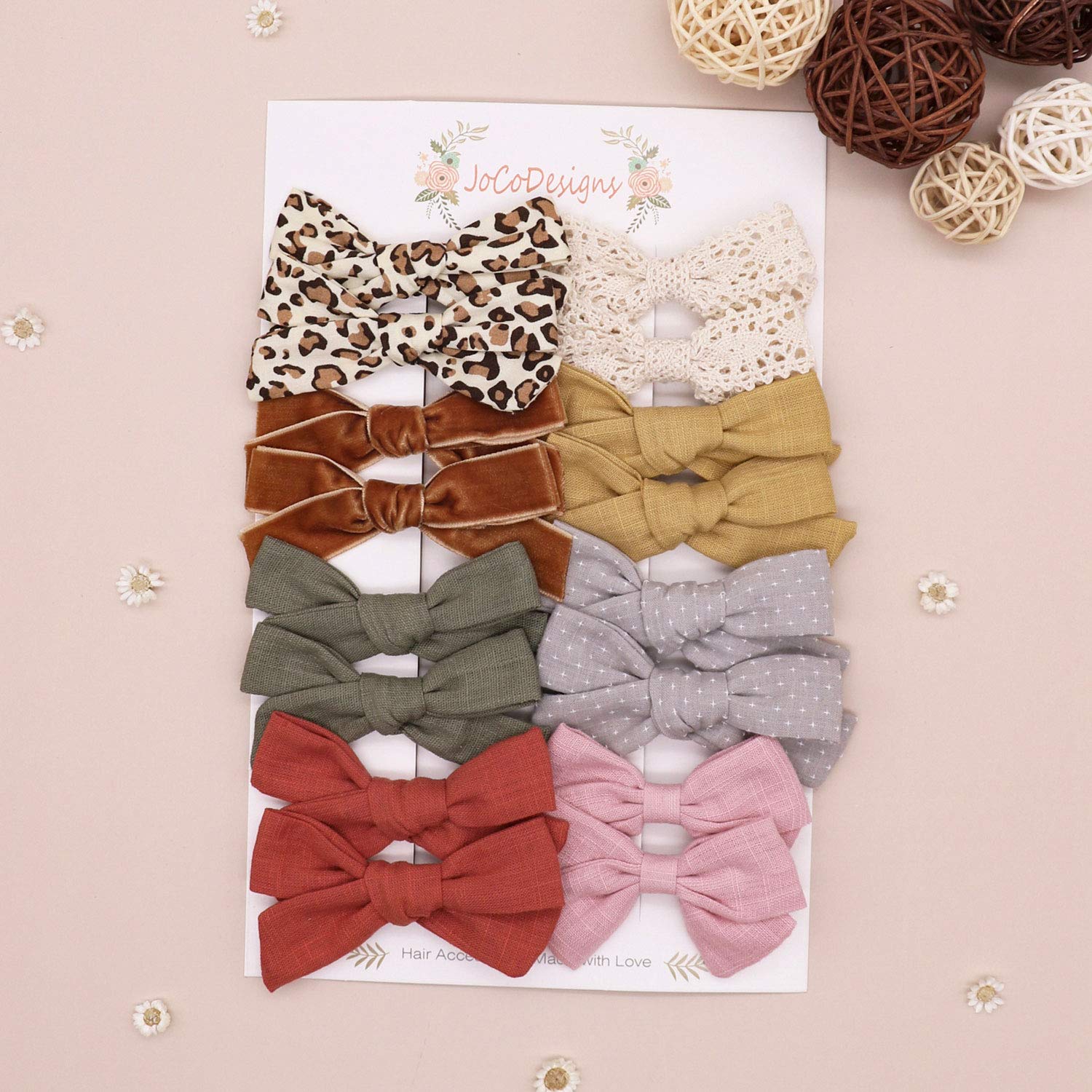 - Q: What styles and colors are included in the assortment? A: The assortment includes a variety of styles such as leopard cotton bows, mustard, rust, pink, sage and gray linen bows, vintage lace bows, and brown velvet bows.