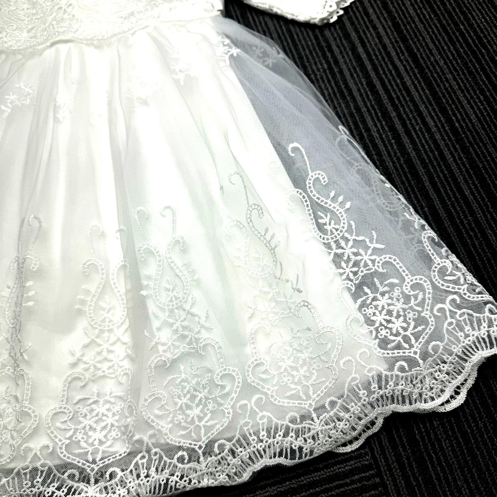 - Q: What is the design style of the dress? A: The dress features an elegant long sleeve design with classic embroidery and layers of tulle to provide fullness.