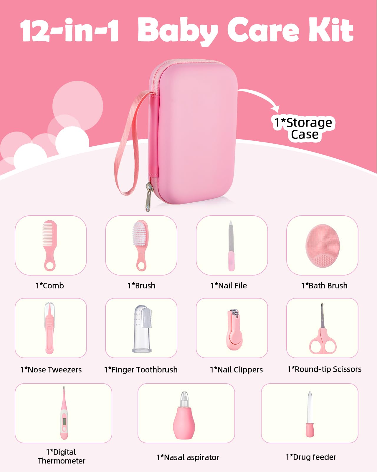 • Q: What items are included in the Lictin Baby Grooming and Health Kit? A: The Lictin Baby Grooming and Health Kit includes a hairbrush, hair comb, round-tip scissors, bath brush, nose tweezers, silicone finger toothbrush, nasal aspirator, protective case, nail clippers, nail file, and a drug feeder, all organized in a sturdy storage case.