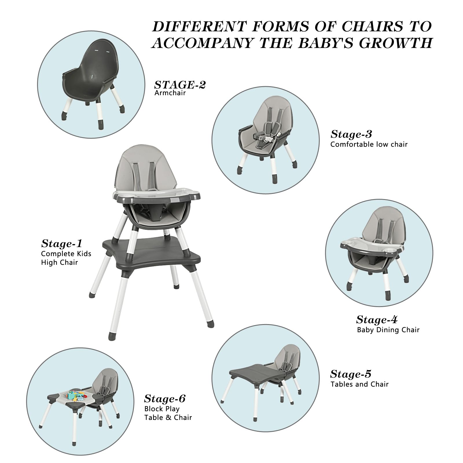 - Q: How does the high chair convert into different modes? A: The DUCTRAP high chair can transform into various modes including a traditional high chair, toddler booster seat, kids learning table, building block table, ordinary stool, and a mini dining chair.