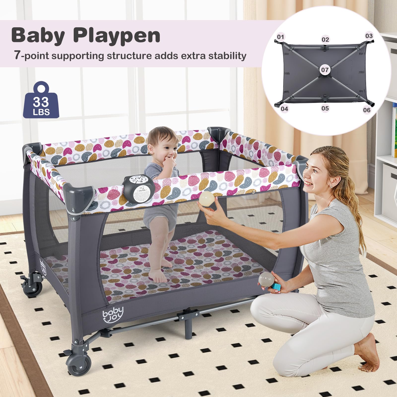 - Q: How does the BABY JOY Pack and Play ensure safety for my baby? A: The design features a stable structure without wobble, safe materials compliant with ASTM standards, and rounded corners to avoid bumps and scratches.