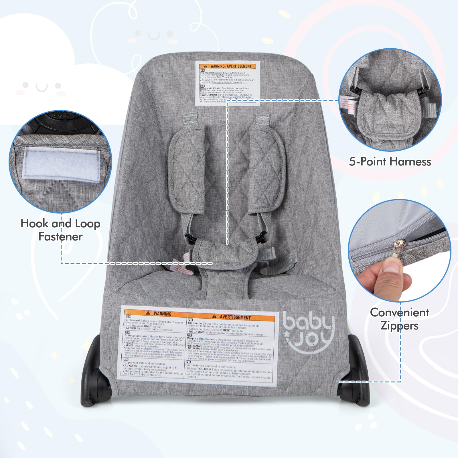 - Q: Is the fabric cover of the bouncer removable and washable? A: Yes, the fabric cover of the BABY JOY Baby Bouncer is removable and machine-washable for easy cleaning.