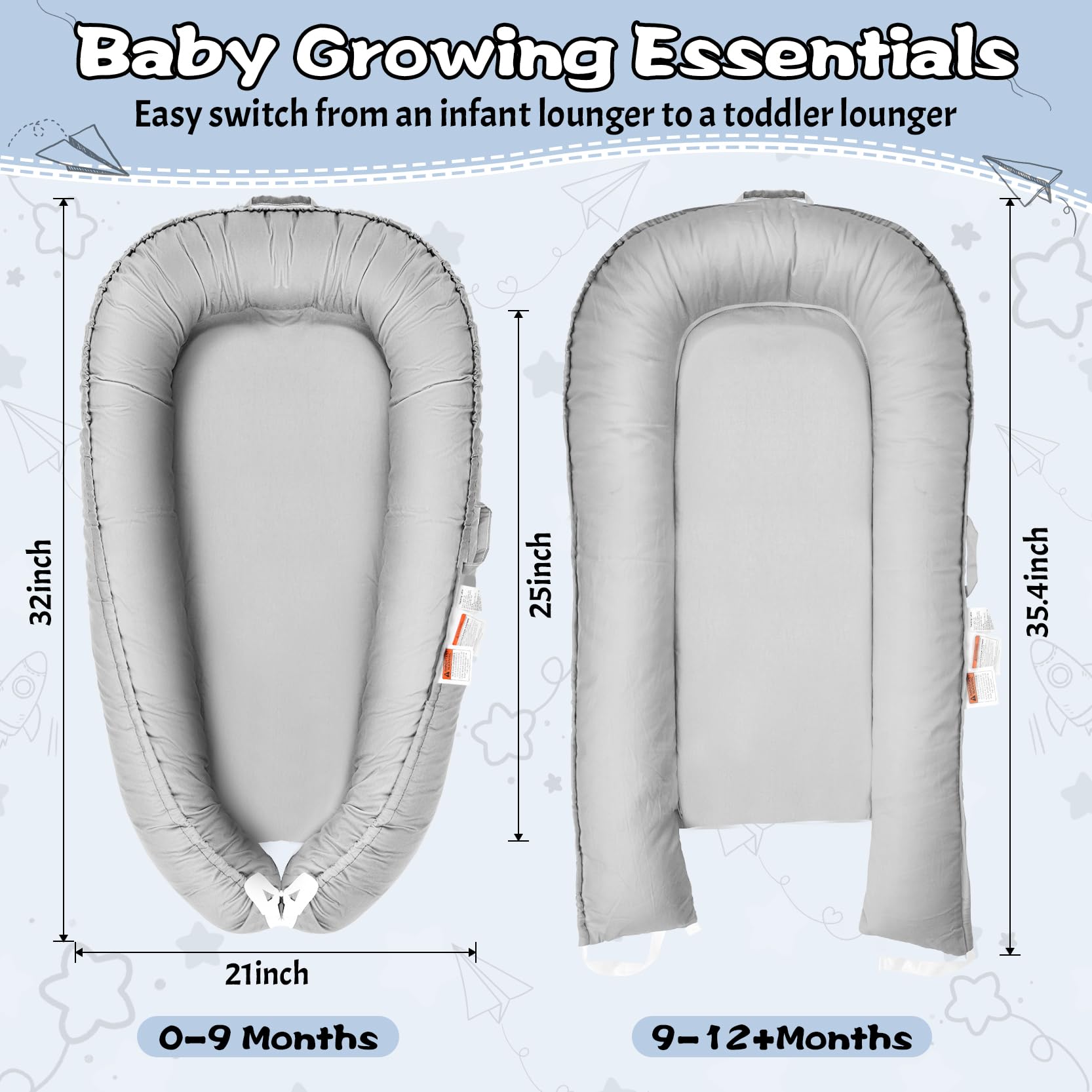 - Q: What is the purpose of the adjustable tie design? A: The adjustable tie design allows you to customize the size of the lounger to fit your baby snugly.
