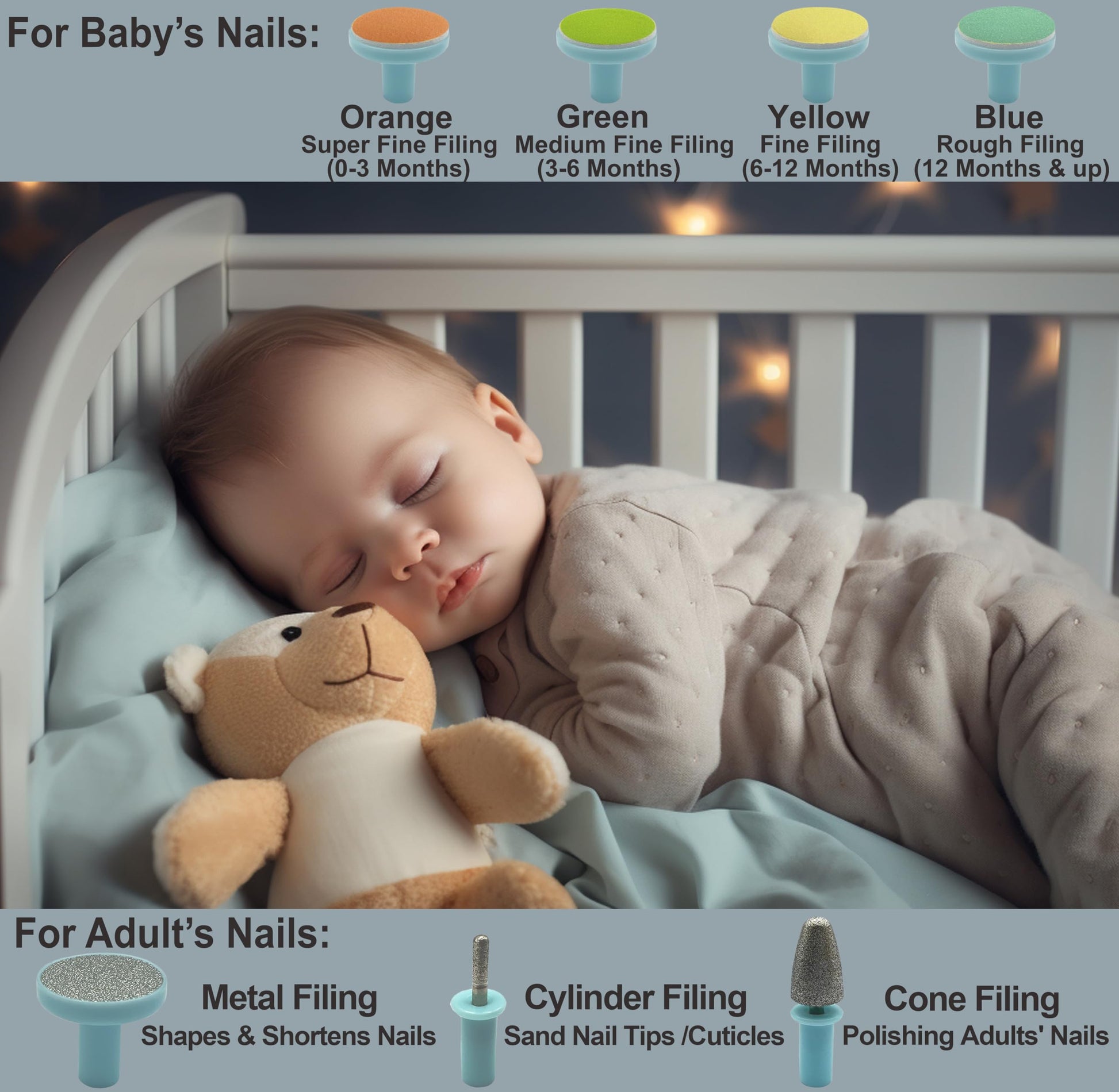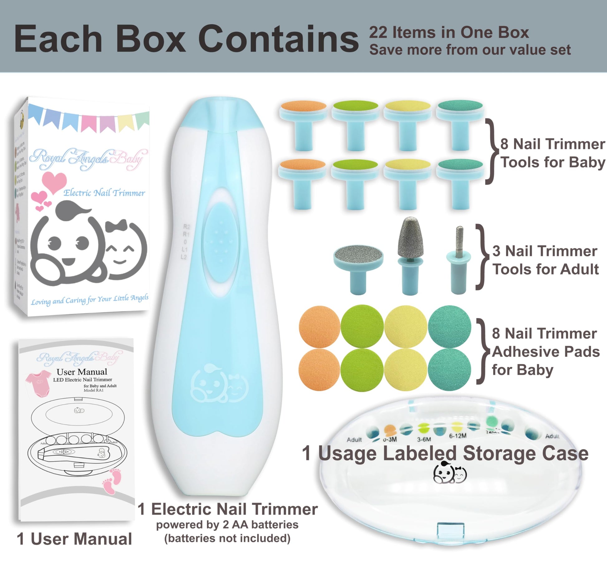 - Q: What is included in the Baby Nail Trimmer 21 in 1 set? A: The Baby Nail Trimmer 21 in 1 set includes 4 cushioned sandpaper attachment tools for baby's nails, 2 for adult nails, and 13 extra replacement tools (12 for baby and 1 for adult). It also comes with a usage labeled organizing case.