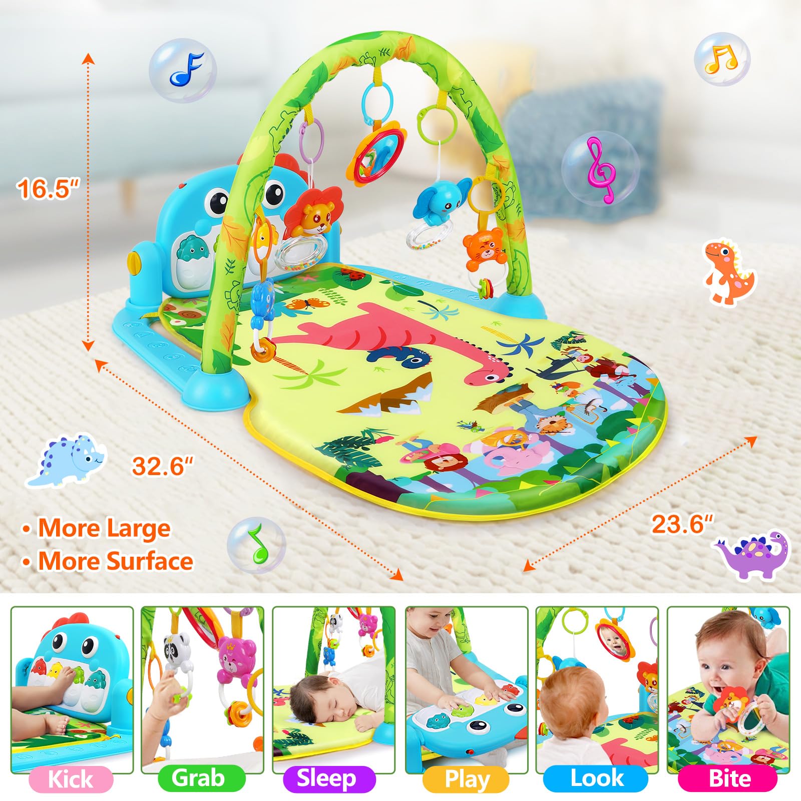 - Q: What features does the UMIKU Baby Play Mat offer? A: The play mat includes a piano with three play modes, five detachable hanging toys, two teething toys, and a washable gym mat designed for comfort and safety.