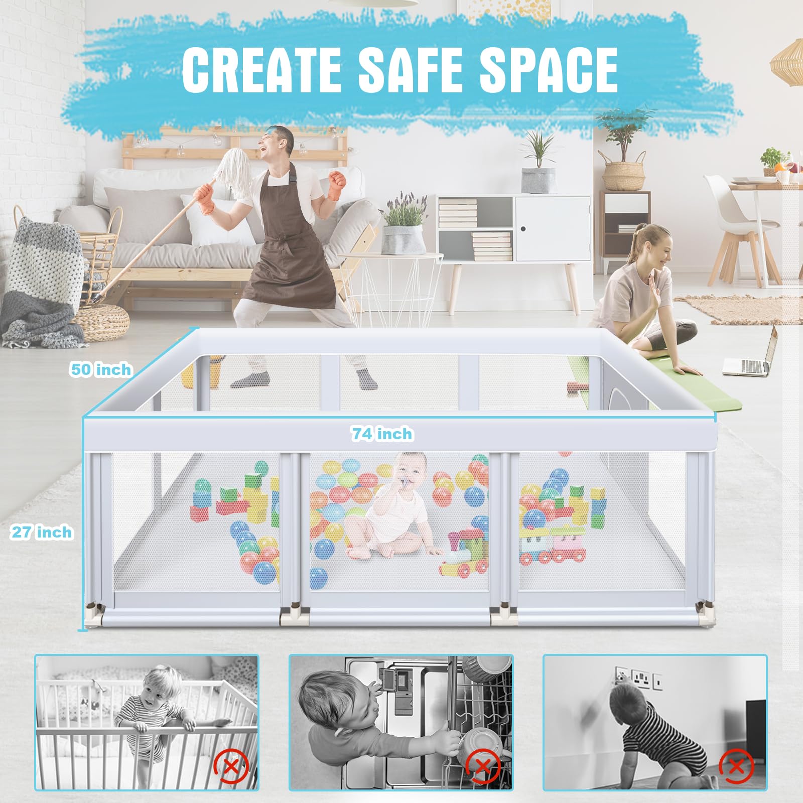 - Q: What are the dimensions of the Baby Playpen? A: The Baby Playpen measures 74 inches in length, 50 inches in width, and 27 inches in height.