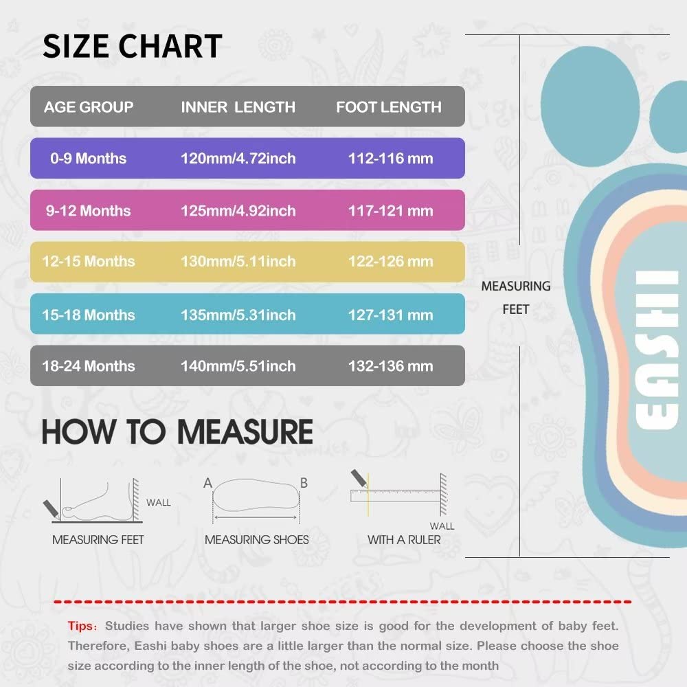 - Q: What sizes are available for these baby shoes? A: The baby shoes are available in five sizes: fits from zero to nine months, nine to twelve months, twelve to fifteen months, fifteen to eighteen months, and eighteen to twenty-four months. This range ensures a proper fit as your child grows.
