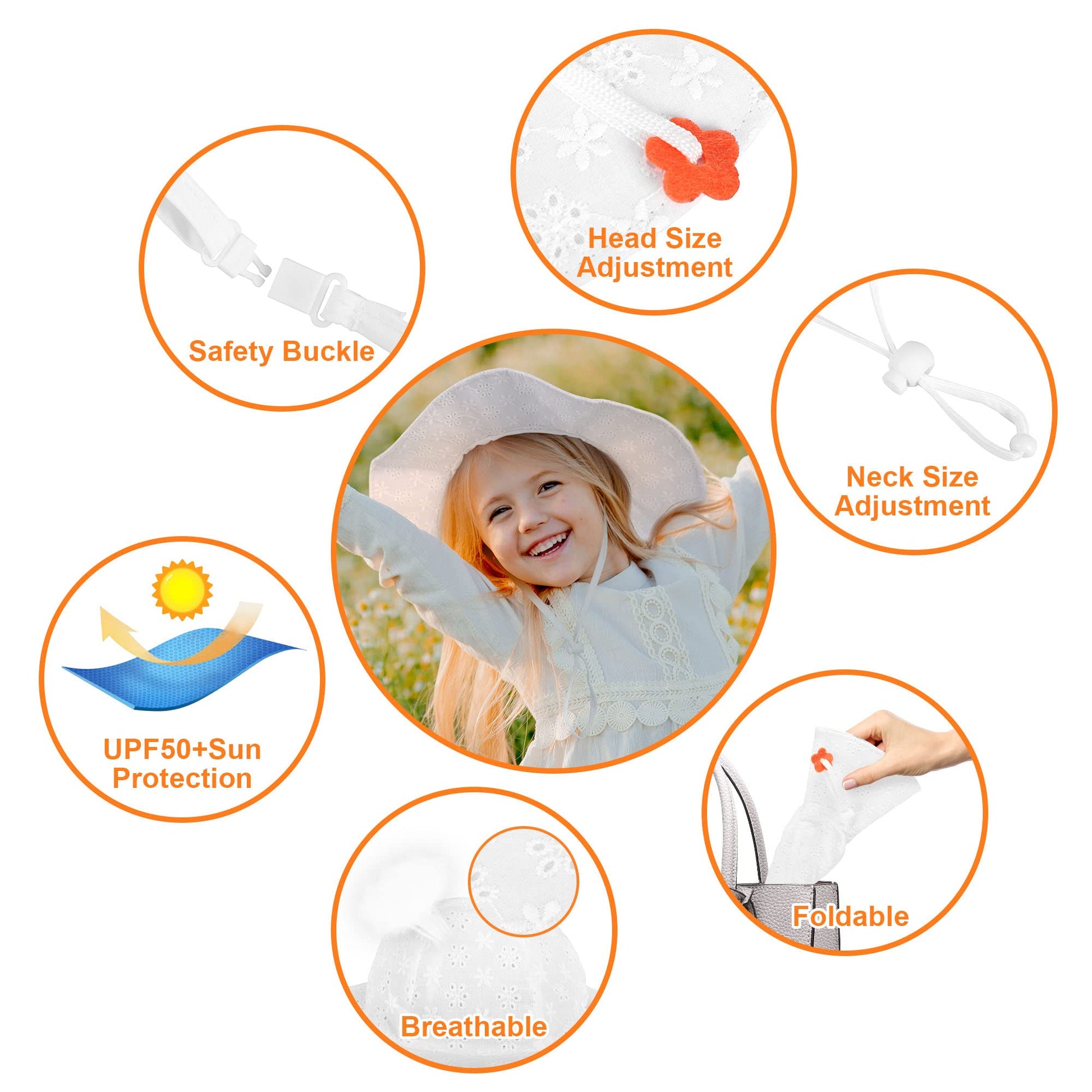 - Q: How does the hat provide sun protection? A: The hat features a UPF 50+ sun protective exterior that helps shield your child's head, eyes, and neck from harmful UV rays.